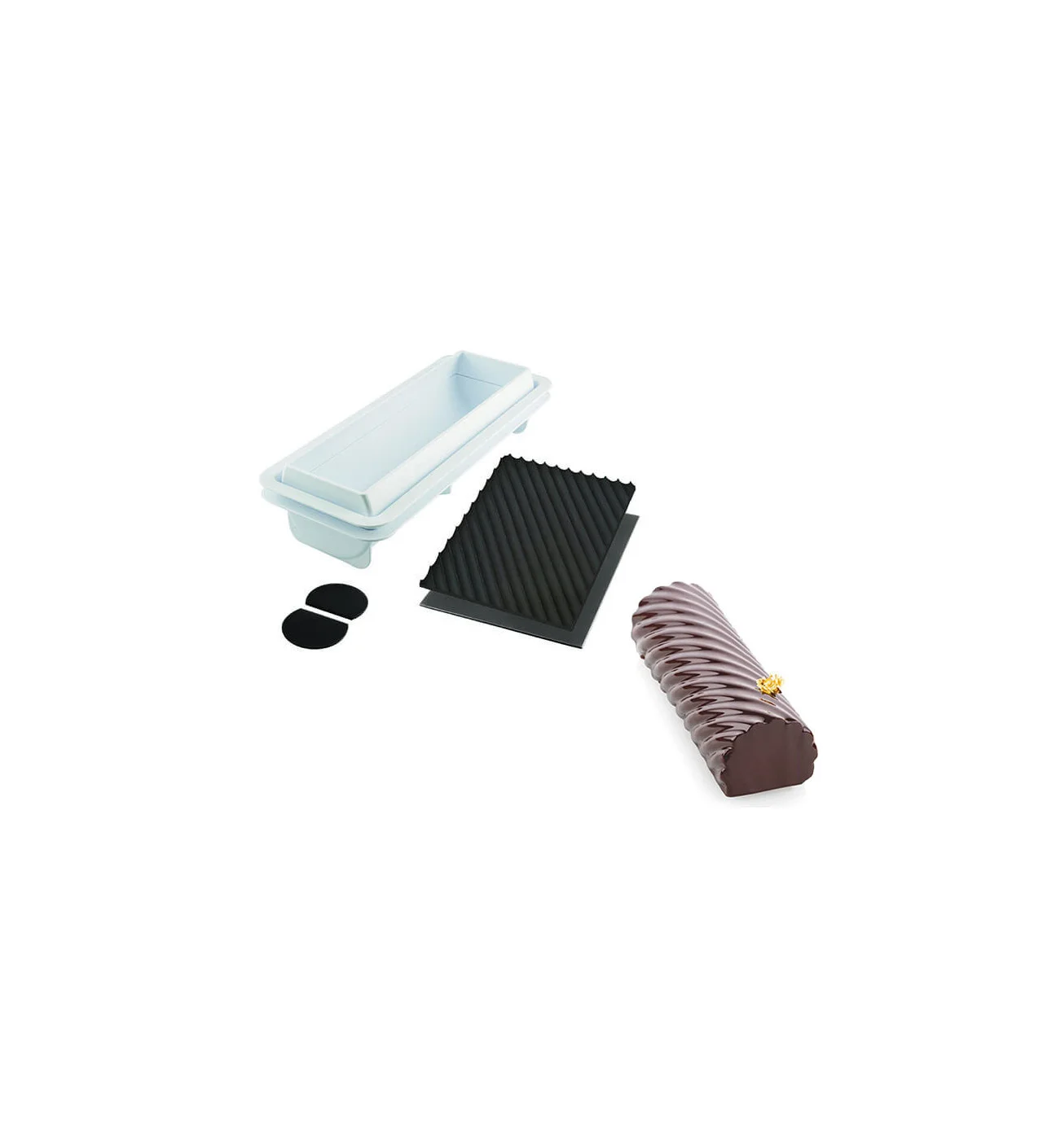 Para elaborar un tronco de Navidad sin cocción y de una manera original: déjate seducir por este kit molde tronco de Navidad de SilikoMart profesional. En el soporte de plástico que sirve como molde para tronco Navidad, podrás colocar el tapete texturizado en silicona para darle una forma en espiral a tu postre para fiestas, sin olvidar los dos extremos para decorar el tronco para garantizar una forma perfecta.