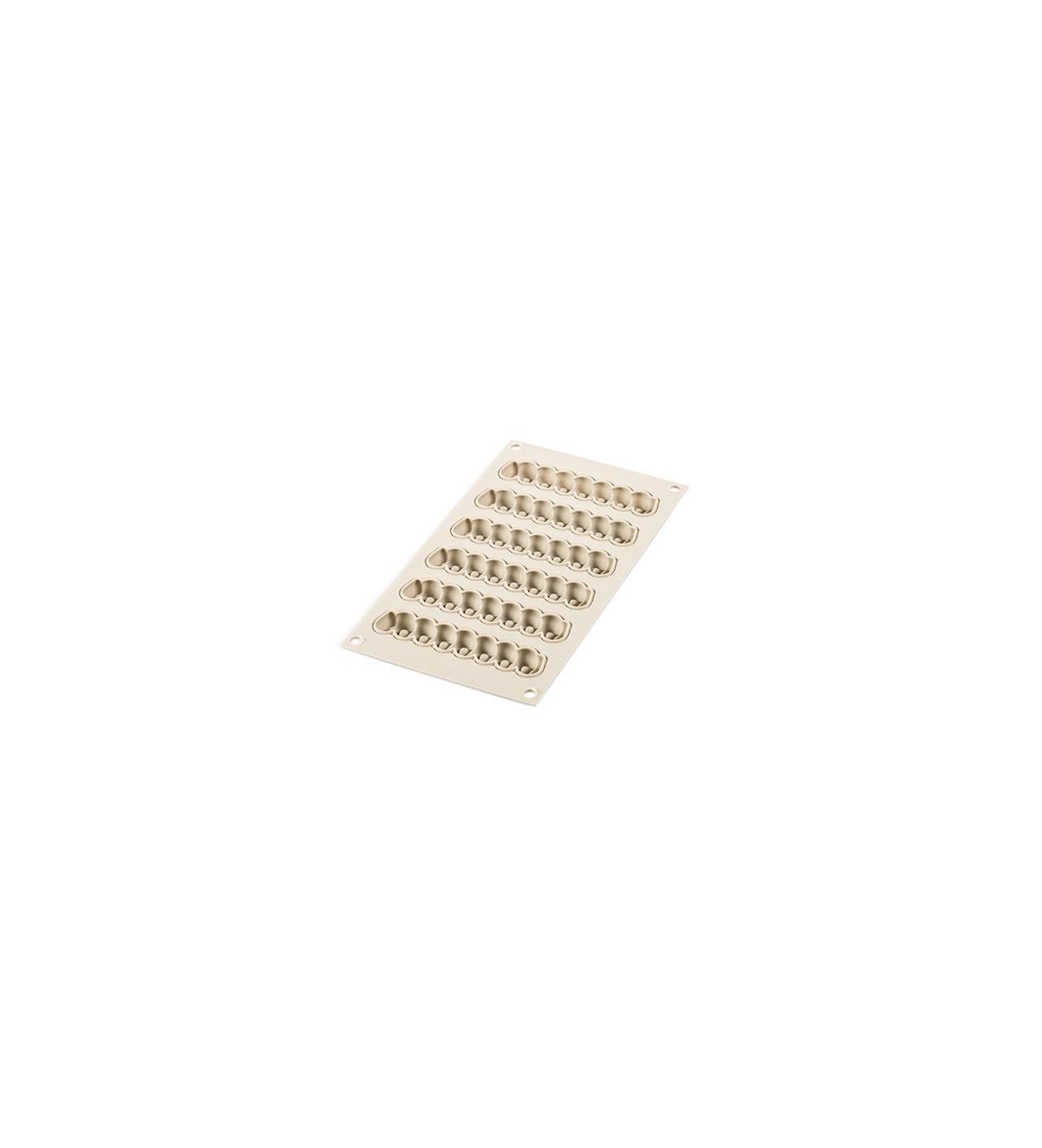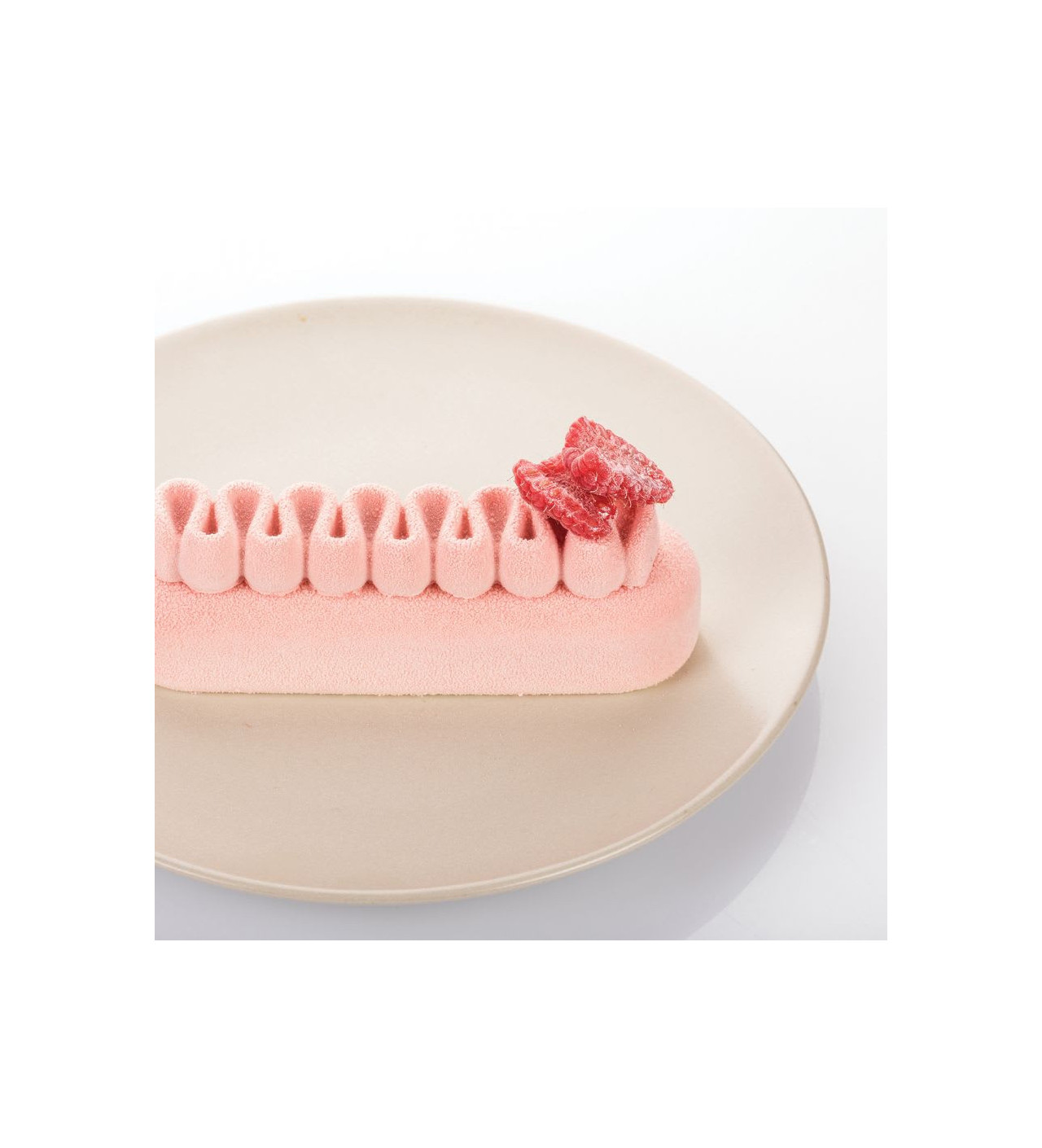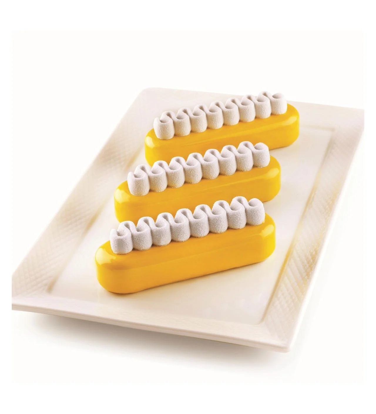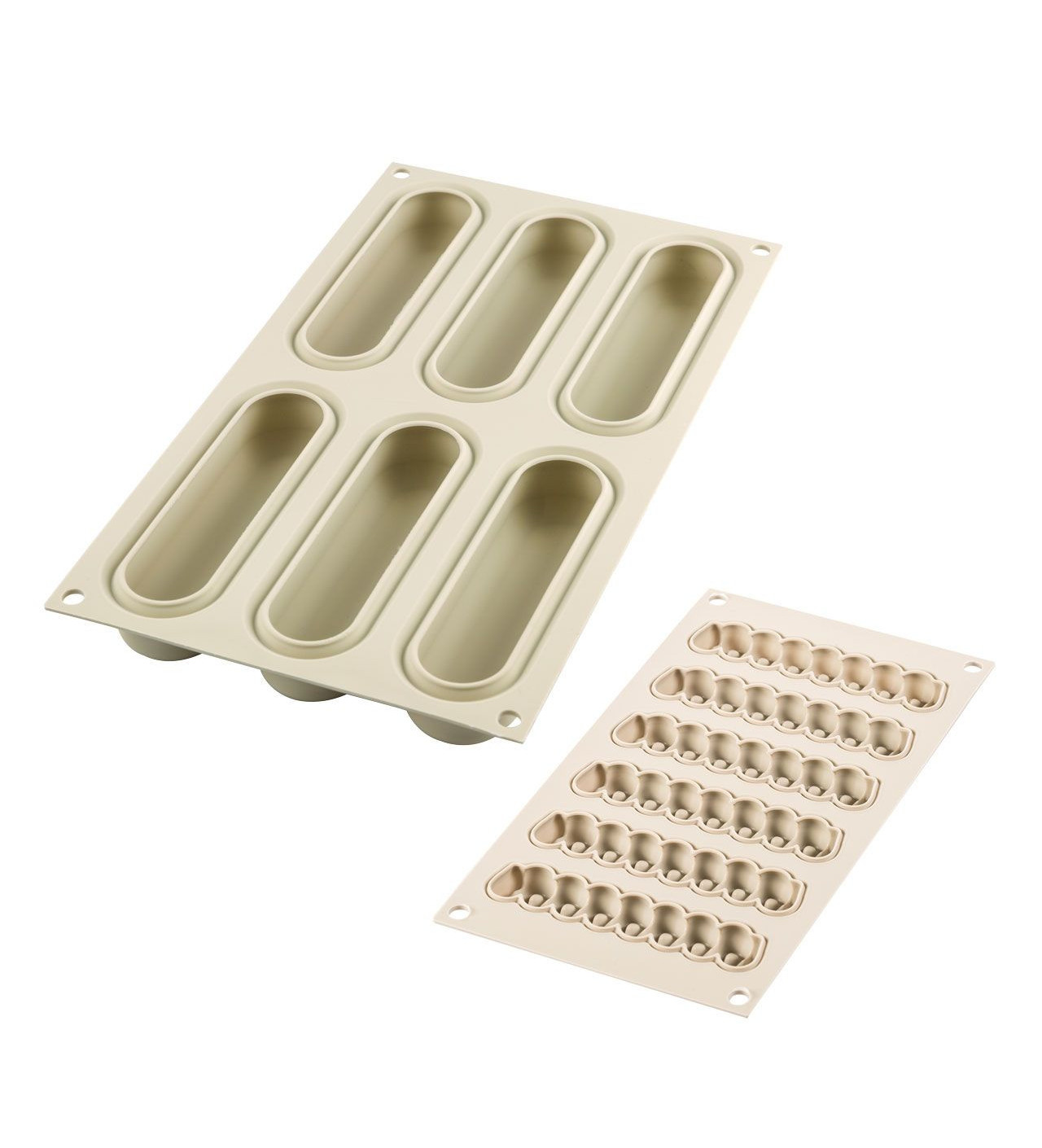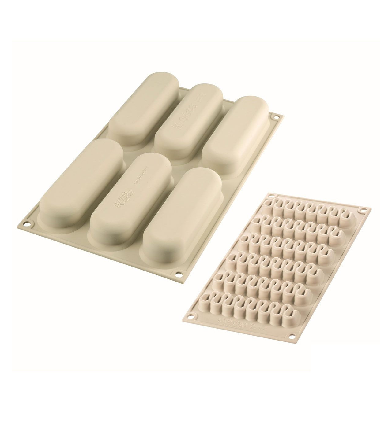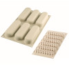 El primer molde silicona SilikoMart te servirá para elaborar la base del postre que puede ser una galleta, un bizcocho genovés o incluso un entremets. Se compone de 6 cavidades ovaladas de 13 x 3,8 x 4 cm.