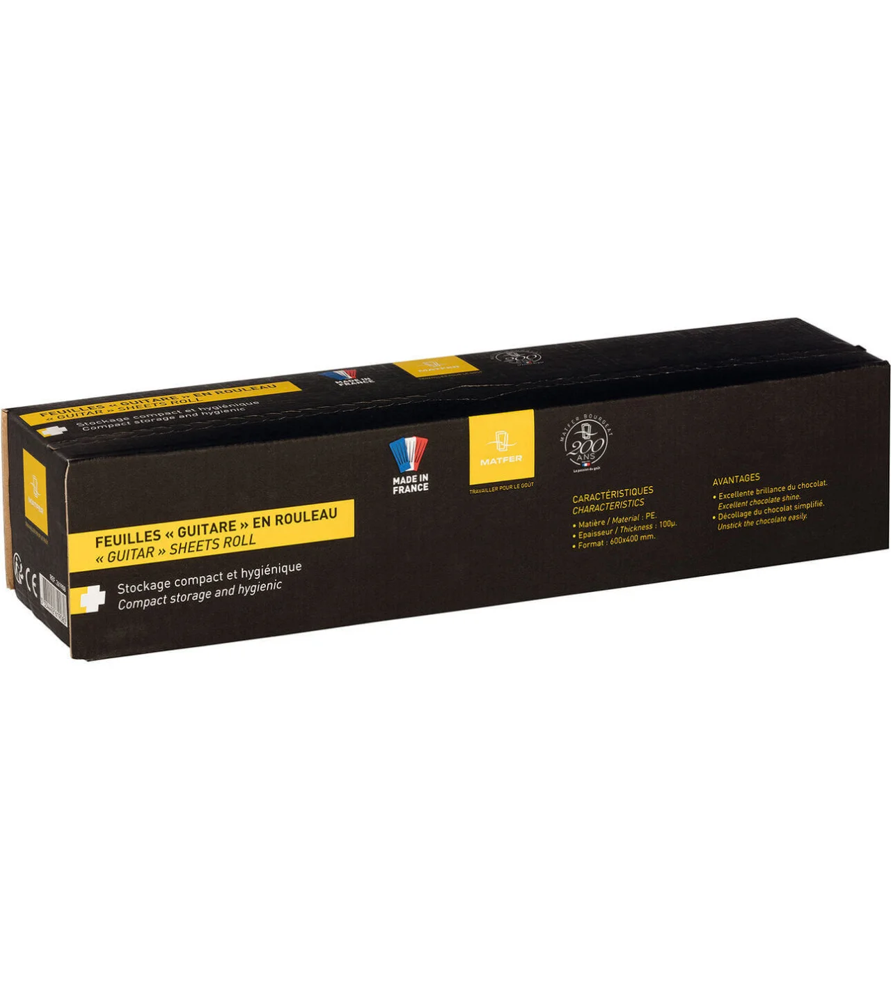 Es antiadherente, la hoja de guitarra de 100 micras facilita despegar el chocolate y le aporta flexibilidad sin romperlo. Hecho en Francia, este papel guitarra de 60 x 40 cm también es un buen complemento para la plantilla de pastelería para elaborar discos o cuadrados de chocolate.