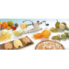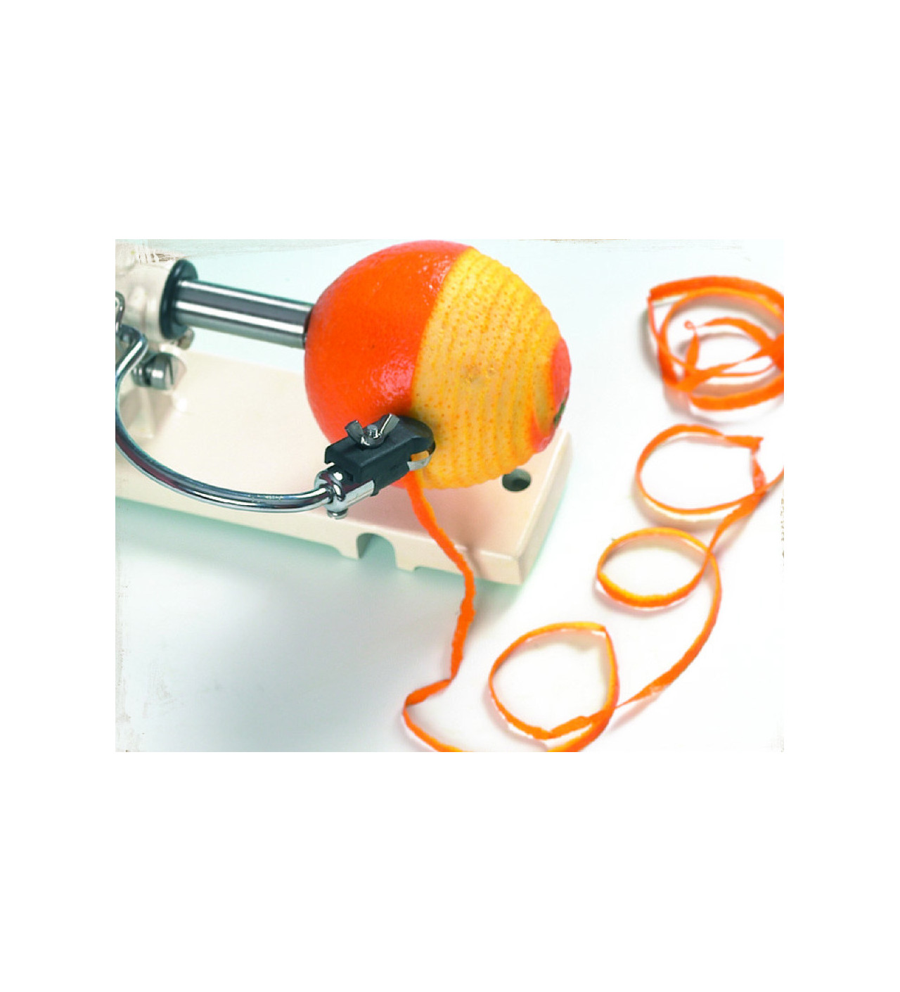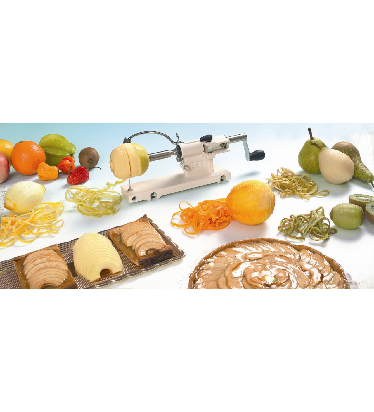 El pelador de manzanas Kali pela, corta y quita el corazón de las frutas con tan solo un movimiento. También se puede usar para pelar patatas y cortarlas en rodajas (chips...) o para rallar limones y naranjas...