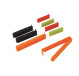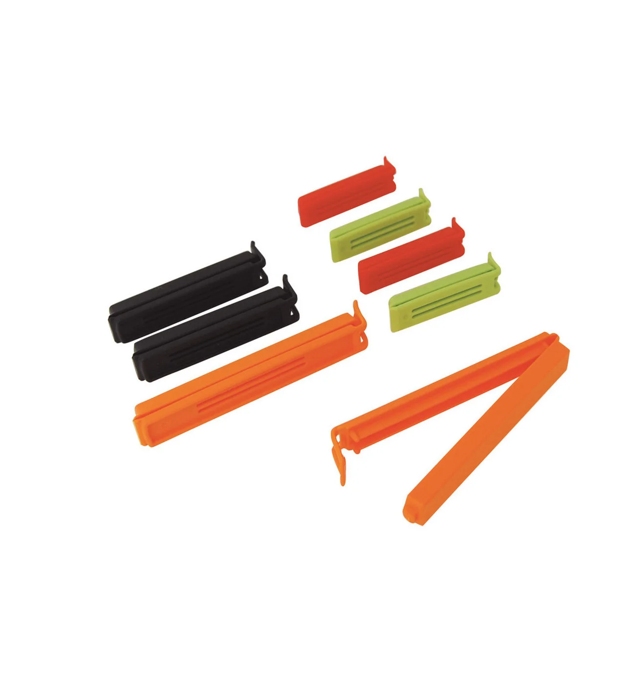 Este lote contiene ocho pinzas de plástico de las cuales cuatro son de 5 cm de ancho, dos de 10 cm y dos otras de 13 cm. Se pueden lavar en el lavavajillas. Estas pinzas también son perfectas para cerrar una bolsa de pan de miga o cereales.