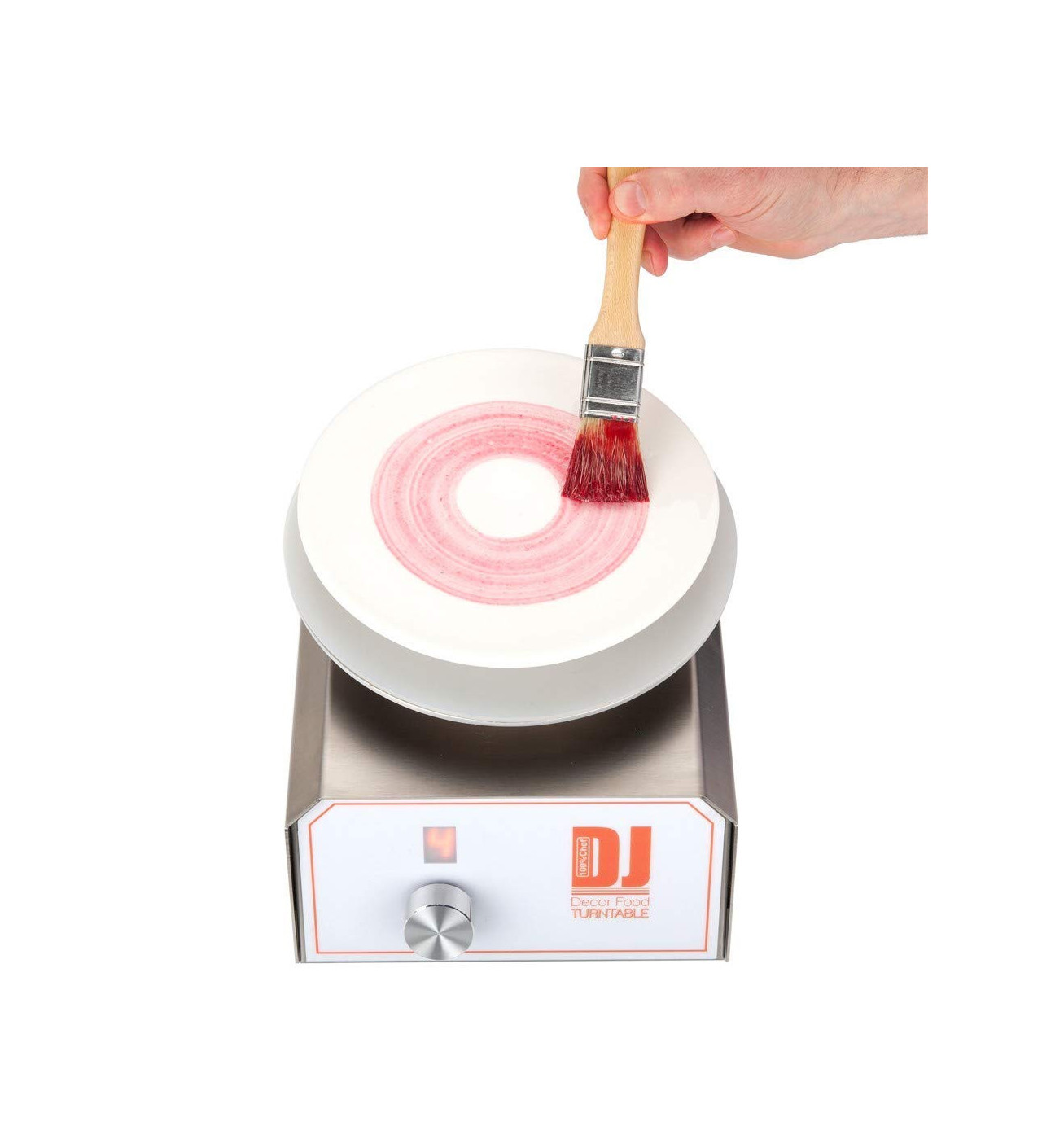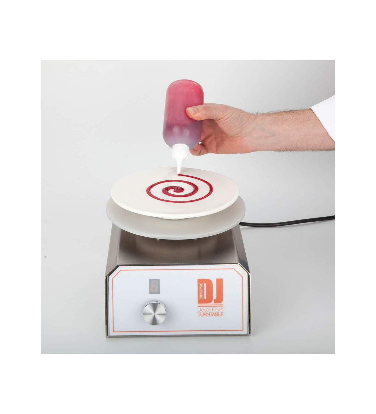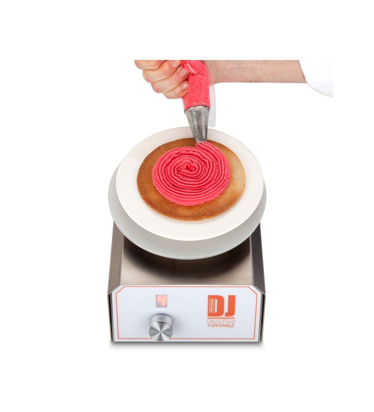 Domina el arte de hacer espirales en tus postres con una manga pastelera y tu plato giratorio para tartas profesional eléctrico. También te resultará muy útil cuando quieras pulverizar chocolate o decorar con aerógrafo.