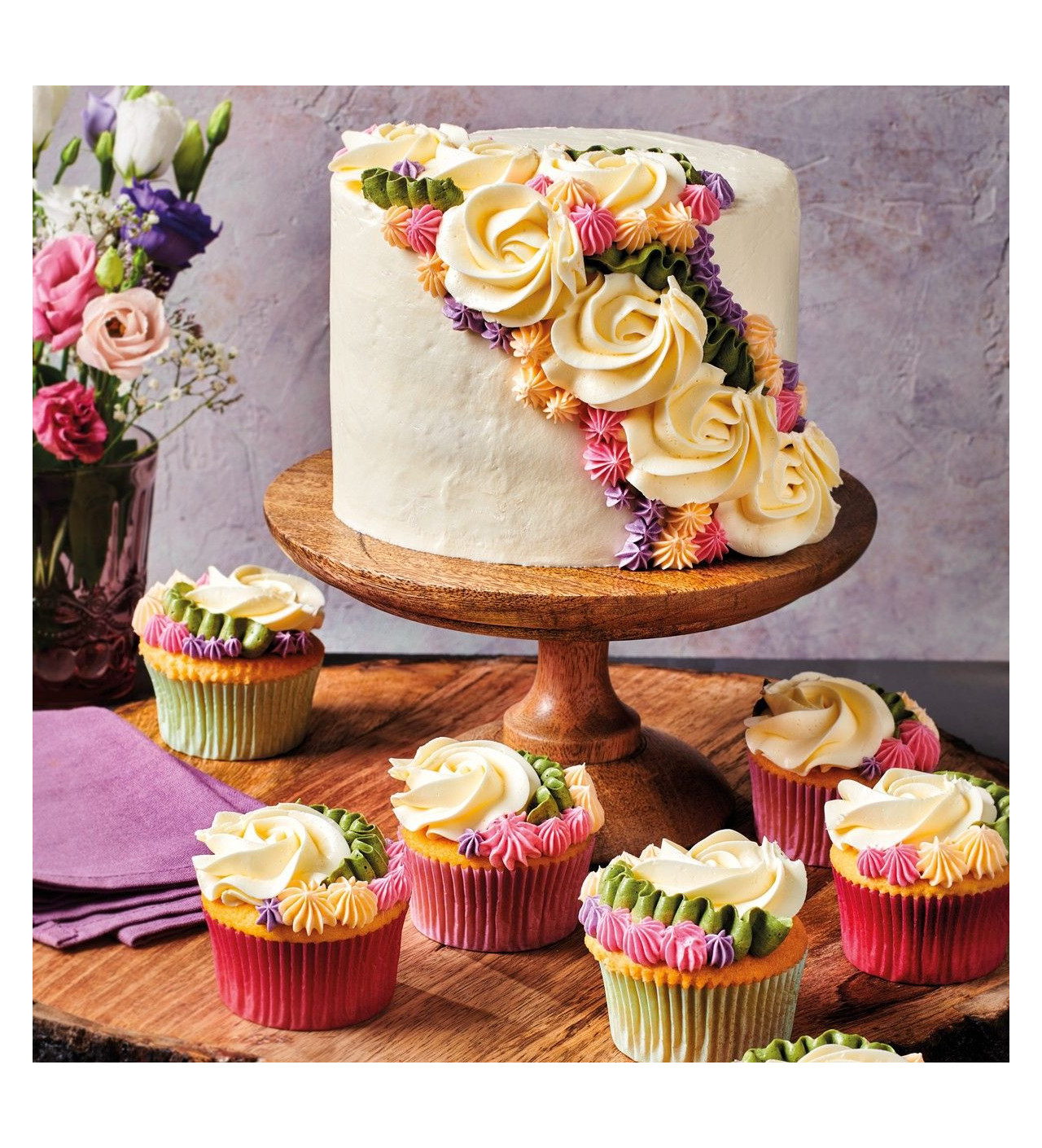 Para decorar una docena de cupcakes o una tarta de 20 cm de diámetro, añade 125 g de preparado buttercream en 125 ml de agua. Cuando la mezcla tenga una textura lisa, colócala en el refrigerador durante 1h.
