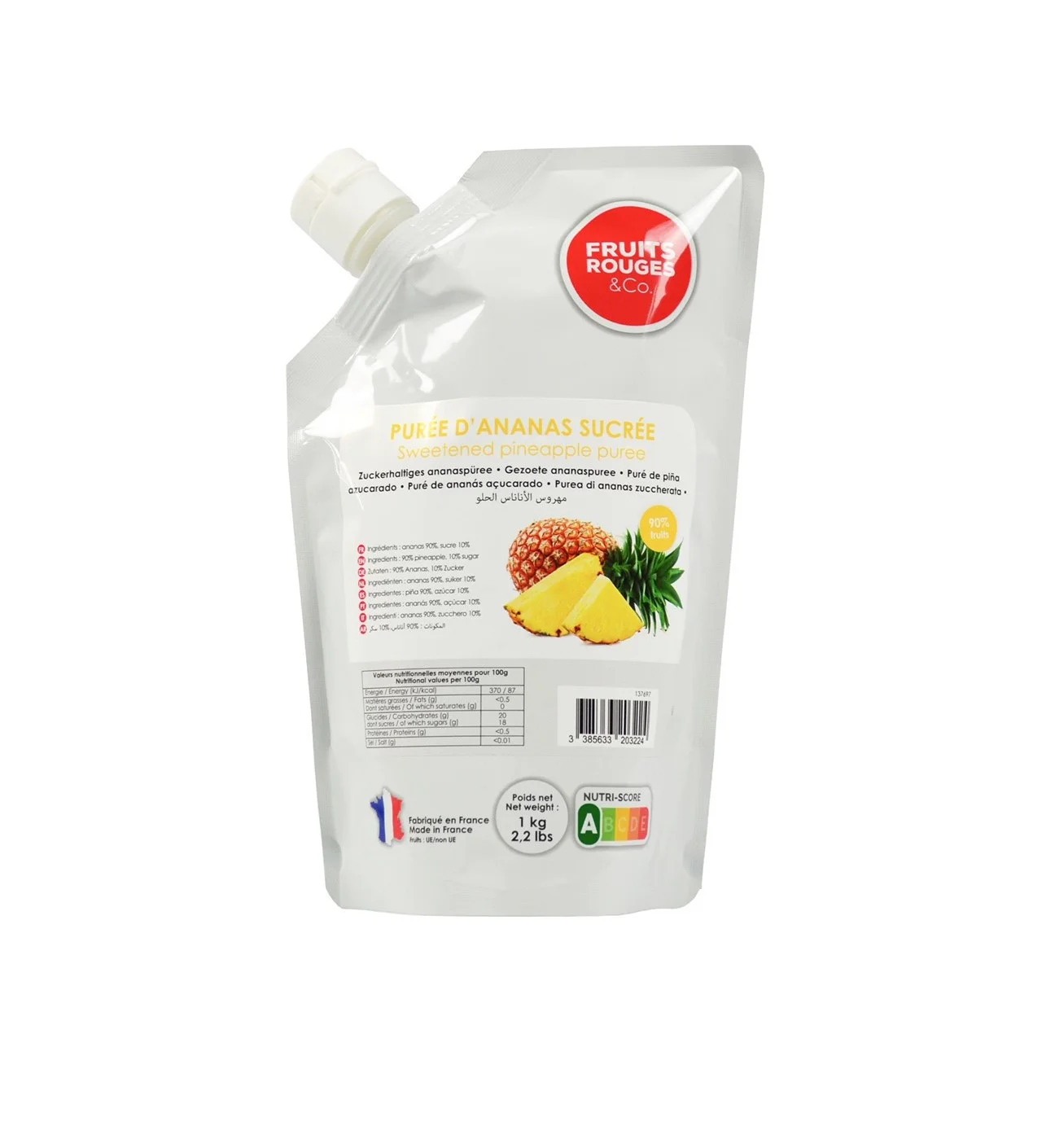 Disfruta de la piña durante todo el año con el puré de piña 1 Kg Fruits Rouges & Co. Los purés de fruta de Fruits Rouges & Co te garantizan el auténtico sabor de la fruta en cualquier temporada, ya sea verano o invierno, gracias a una rigurosa selección de fruta fresca según su variedad y un grado de madurez bien preciso. Transformadas en Francia, en Laon, en los talleres de Fruits Rouges & Co, la fruta utilizada en los purés de frutas es seleccionada, triturada y refinada con el mayor cuidado, respetando las características de la fruta fresca en cada receta. El puré de piña 1 Kg Fruits Rouges & Co te asegura un color y un sabor idénticos a la fruta fresca, como si viniera directamente de la isla de La Reunión.