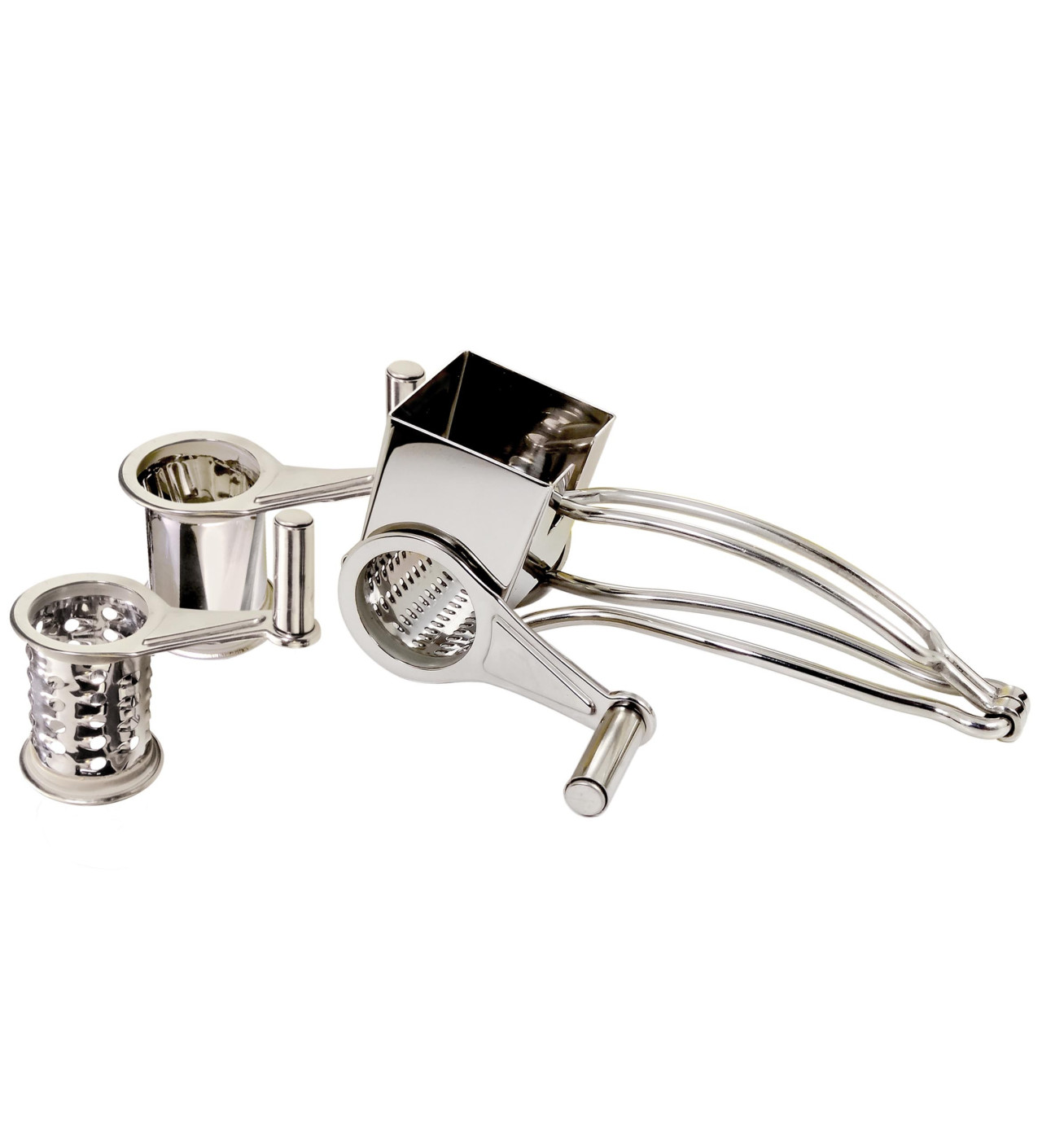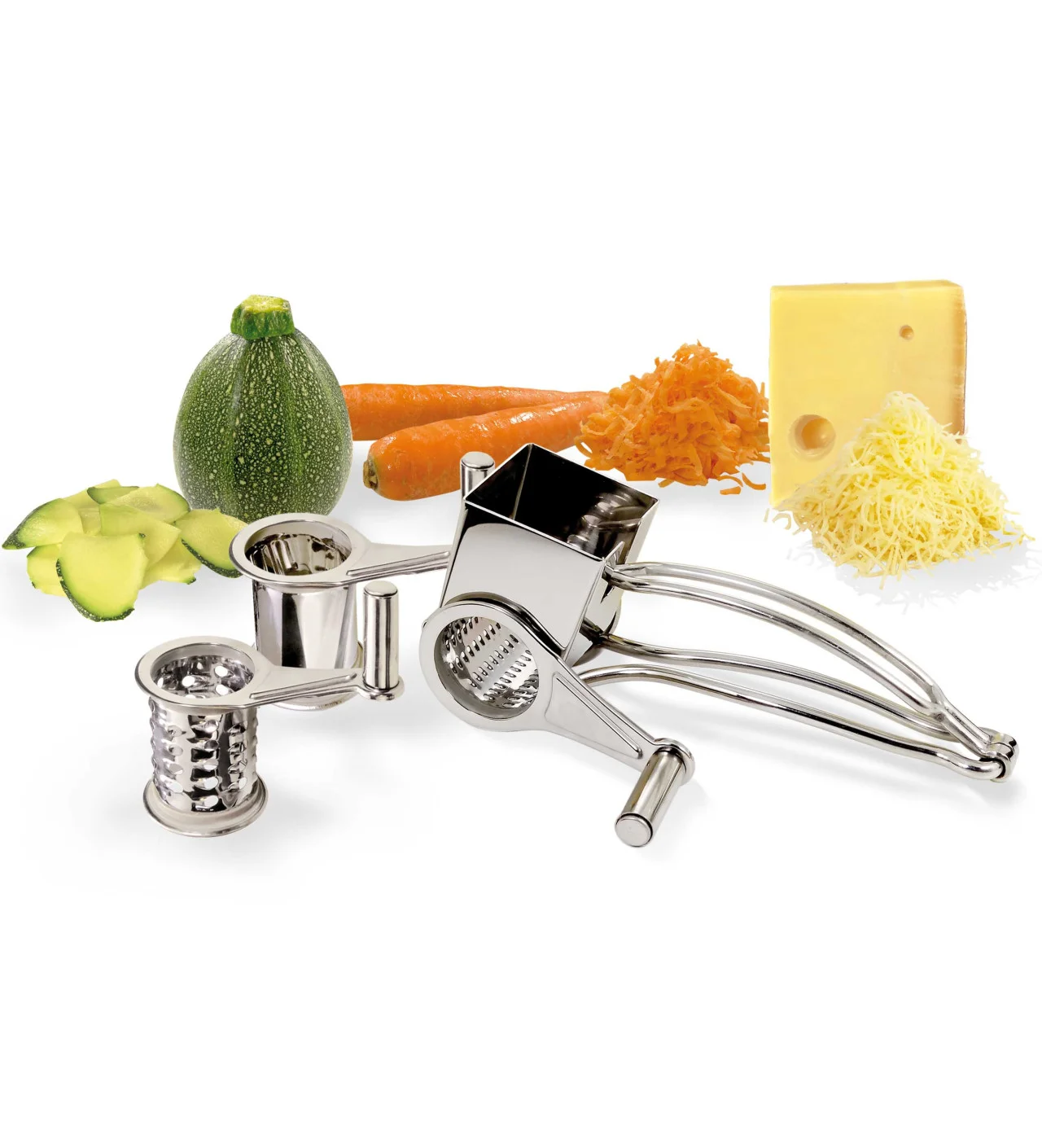 El molinillo de queso está equipado con 3 tambores de acero inoxidable intercambiables.