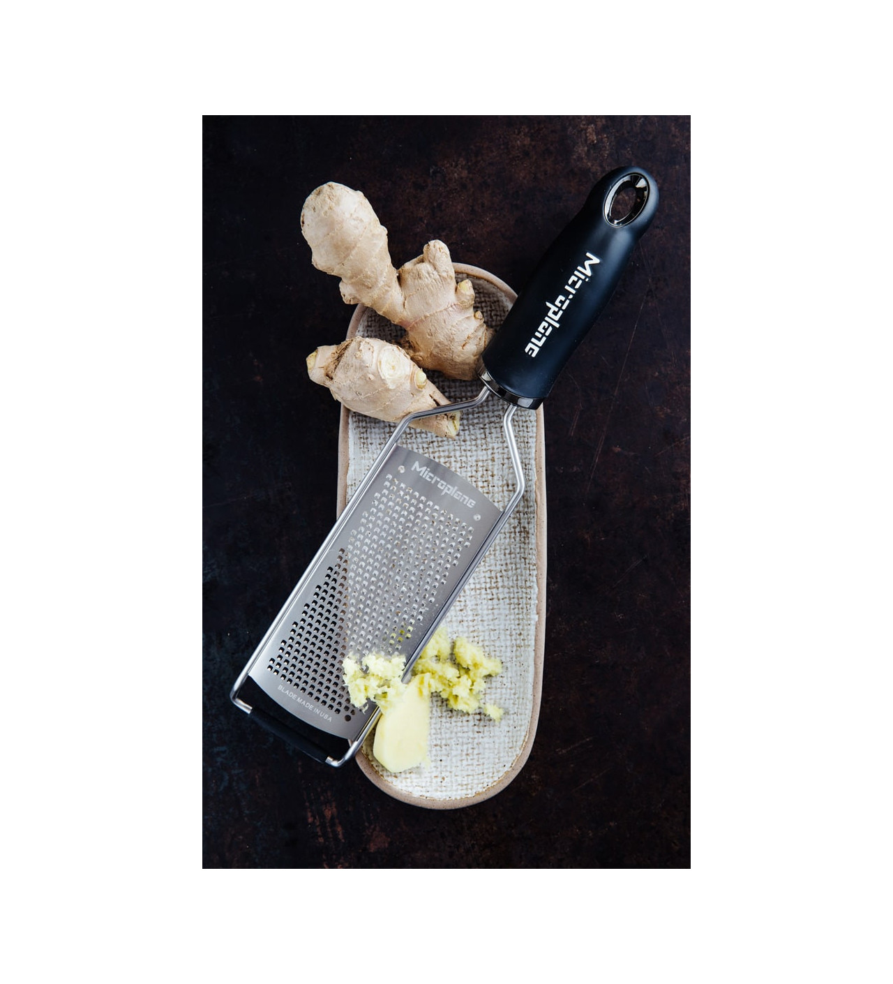 El rallador Microplane fino de la colección Gourmet es ideal para rallar cítricos, quesos de pasta dura, ajo y especias como el pimiento picante, la canela, la nuez moscada o el jengibre.