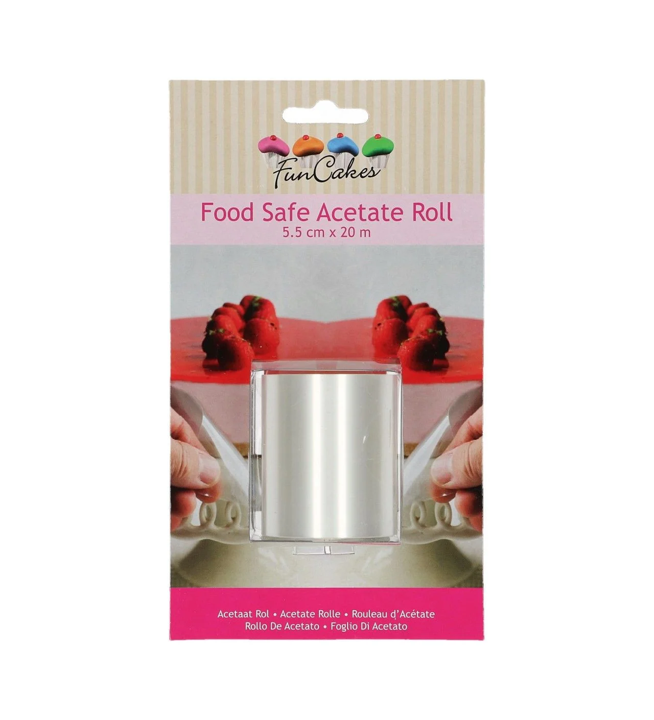 Si necesitas desmoldar un postre o una mousse para que los bordes queden sin defectos, el rollo de acetato es ideal. Este tiene una longitud de 20 m y una altura de 5.5 cm. Este acetato para tartas, llamado “rodoide” en Francia, sirve para realizar decoraciones de chocolate con volumen.