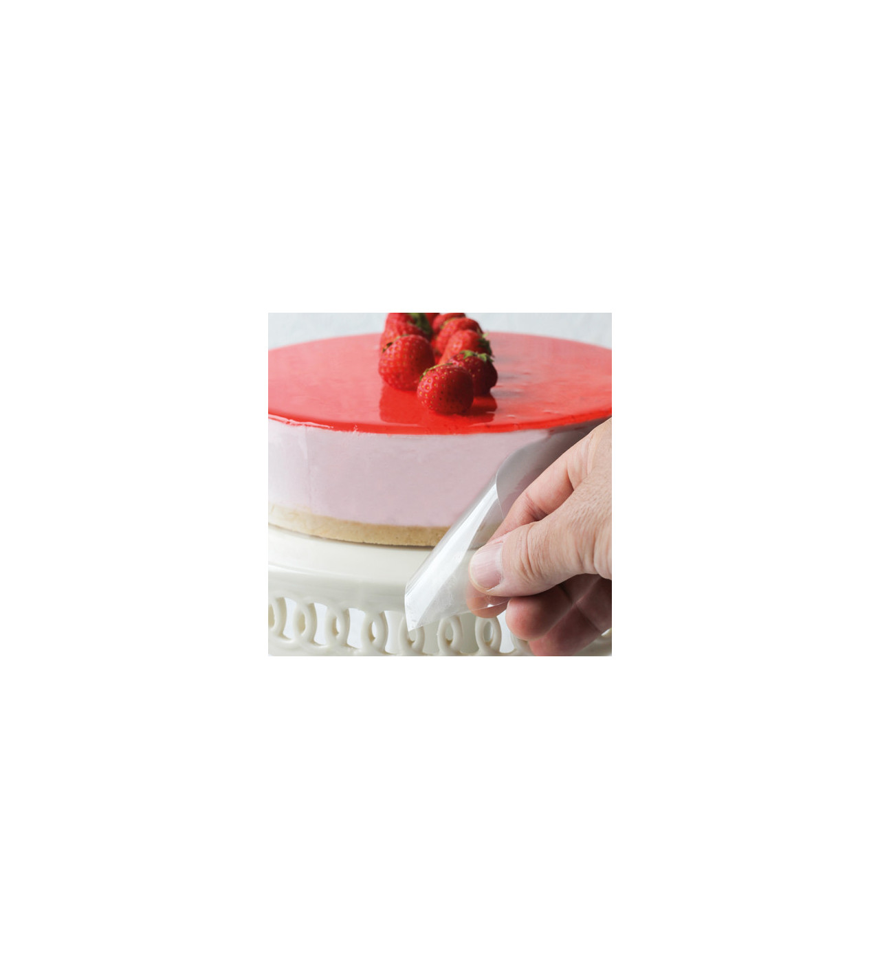 Este acetato para tartas, más conocido en francés como “rodoide” sirve para desmoldar fácilmente tu torta Charlotte de fresa o tu tarta de tres chocolates. Recorta una tira del rodoide para forrar el molde. Está compuesto de acetato de celulosa y tiene una superficie lisa y brillante.