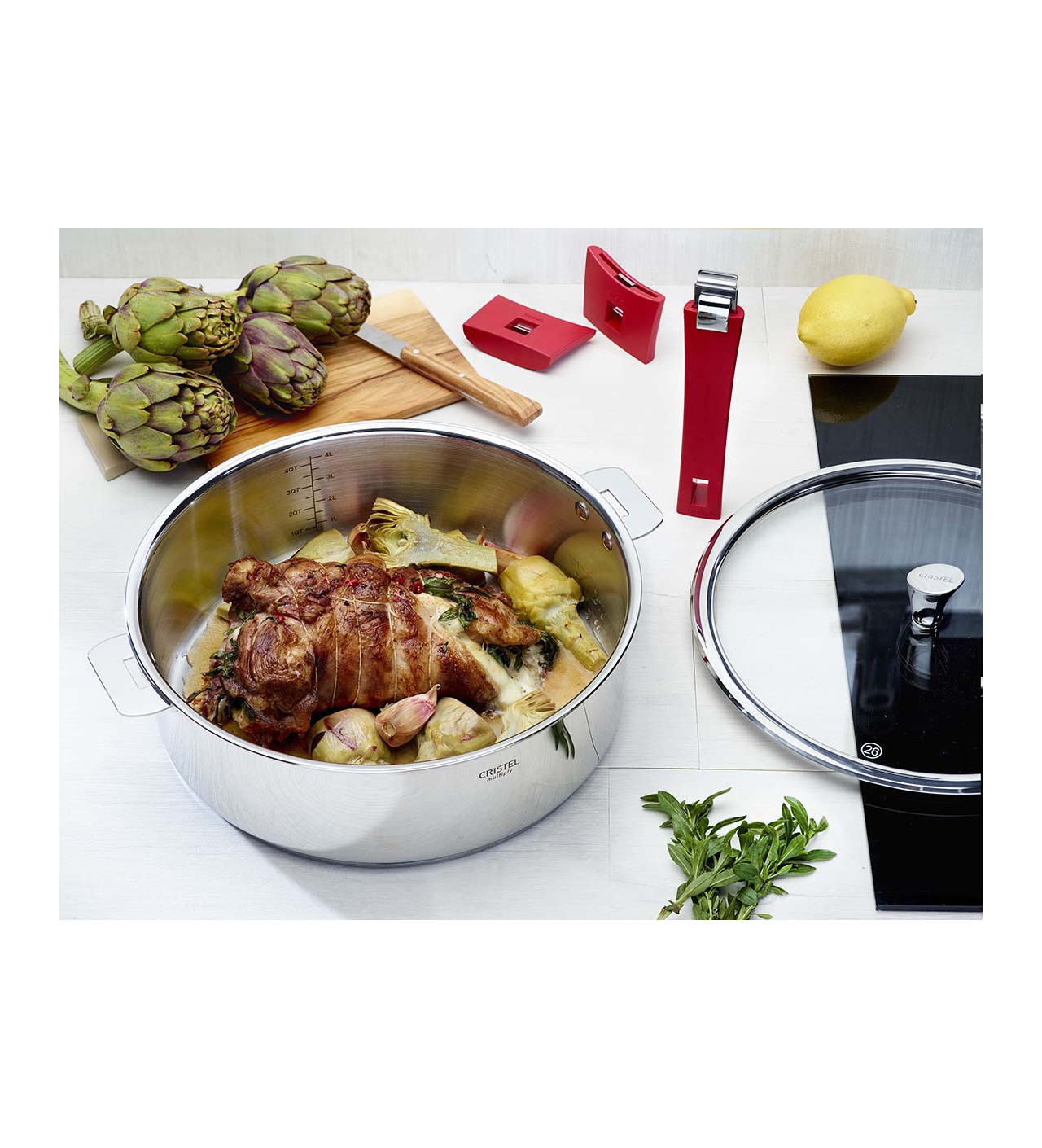 Los mangos y asas extraíbles de Mutine son indispensables para la sartén alta Cristel. Están disponibles en varios colores. Estos accesorios desmontables Cristel se sujetan firmemente a todos los utensilios de las gamas extraíbles Cristel.
