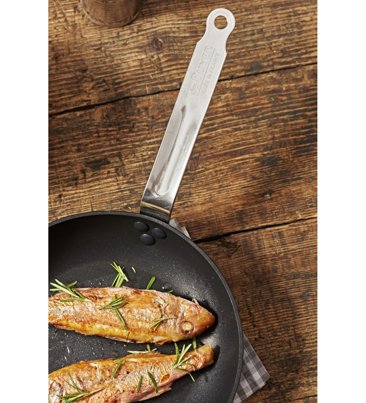 Apta para todas las fuentes de calor, podrás usar esta Sartén de Buyer en placas de gas, inducción, vitrocerámica, eléctricas e incluso en el horno (hasta 230°C). Agradable al tacto, esta Sartén 24 cm Antiadherente fabricada en Francia tiene un mango curvado al estilo francés.