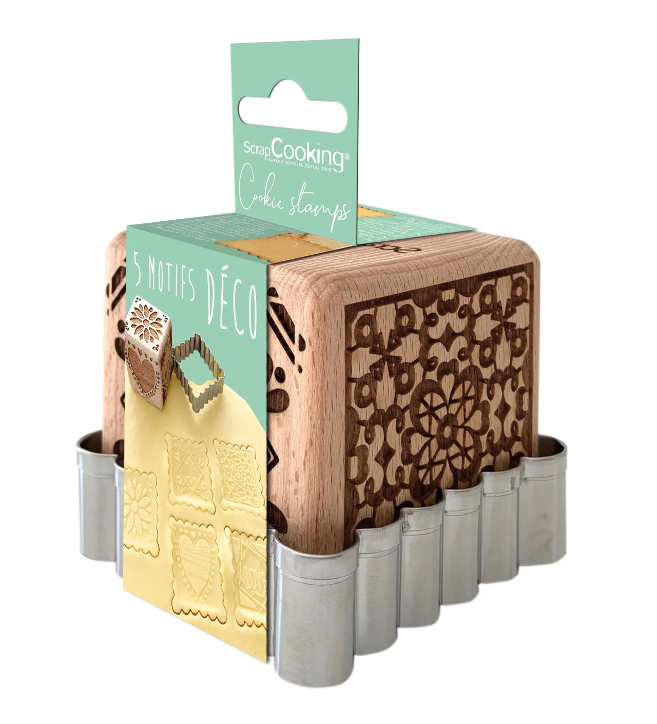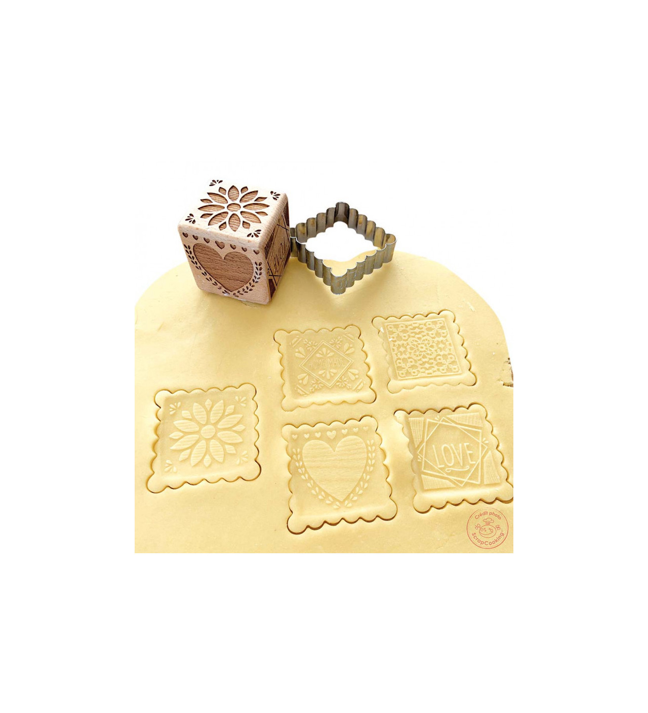 Este sello para galletas en forma de cubo de madera tiene cinco caras con motivos diferentes para variar y personalizar tus decoraciones de galletas. El sello para galletas viene con un cortapastas cuadrado acanalado diseñado especialmente para adaptarse a las dimensiones del cubo. Prepara tu masa, pon el cubo y presiona para estampar el motivo de tu elección. Solo basta con cortar tu galleta con el cortapastas con una simple presión ¡y listo!