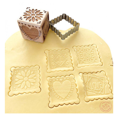 Este sello para galletas tiene mango de madera y una base de silicona donde podrás colocar tu mensaje. Solo te queda extender y cortar tu masa para galletas antes de poner el marcador para galletas personalizado Ø 6,5 cm y hornearlas.