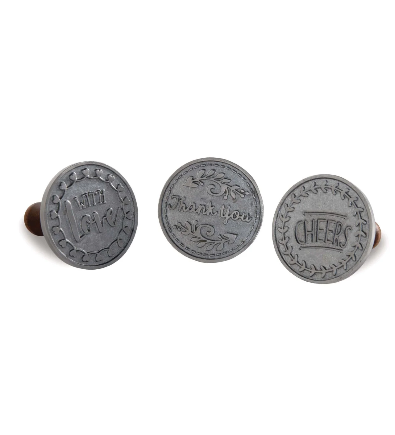 Fabricados con un elegante y cómodo mango de madera, estos sellos galletas Nordic Ware de aluminio se distinguen por su resistencia y calidad. Los sellos galletas están adornados con lindas palabras "With Love", "Thank You" y "Cheers", por lo que son perfectos para muchas ocasiones. Muestra a tus seres queridos cuánto los quieres con los sellos greetings Nordic Ware.