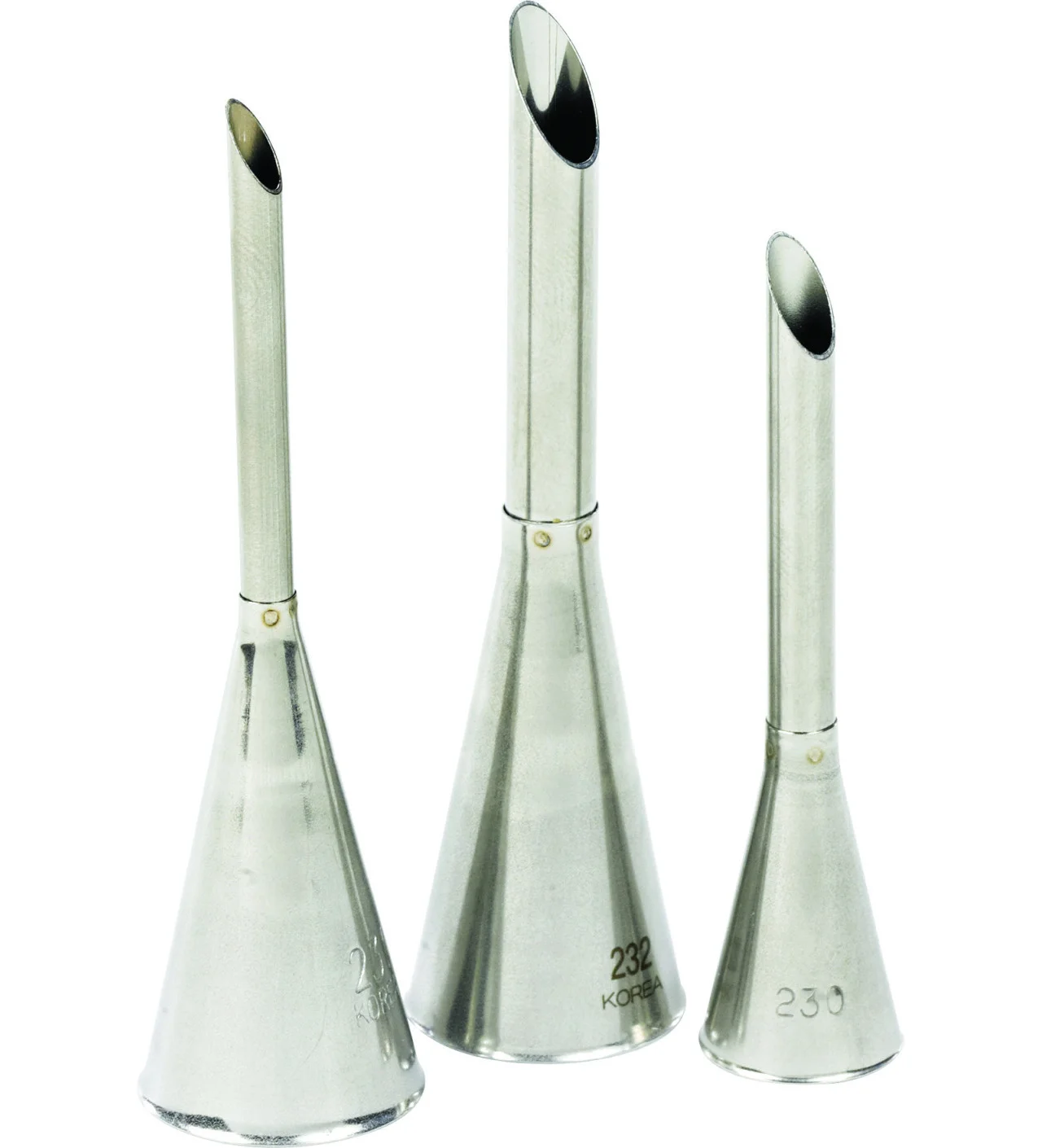Este set de 3 boquillas en acero inoxidable sirve para rellenar choux. El tubo está soldado en la base de la boquilla.