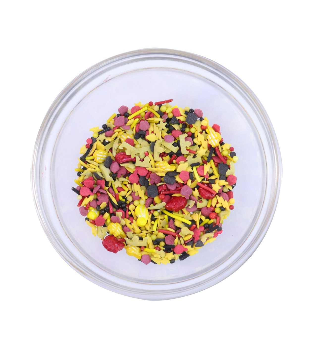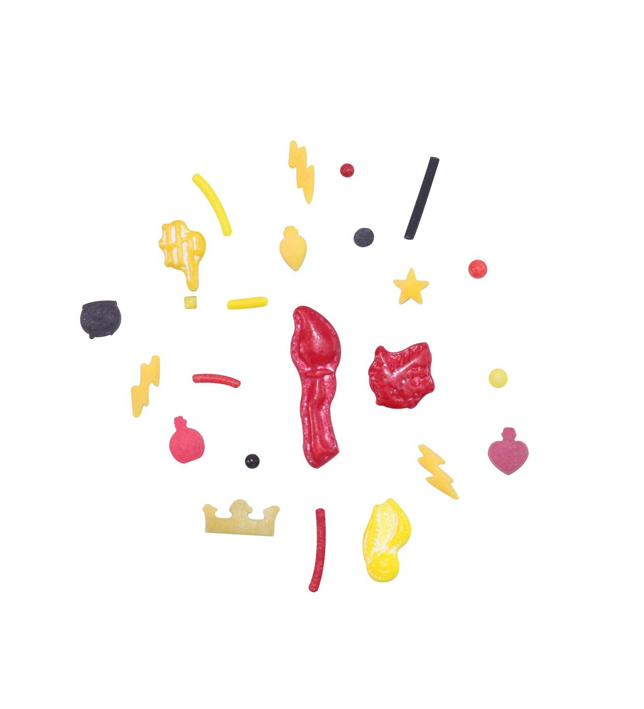 Esta mezcla de adornos de azúcar Harry Potter en tonos rojo, amarillo y negro es perfecta para completar tus creaciones con la magia de Hogwarts. Incluye un variado mix de formas como rayos, calderos, estrellas, escobas, bolitas y fideos, que aportan dinamismo y originalidad a tus postres.