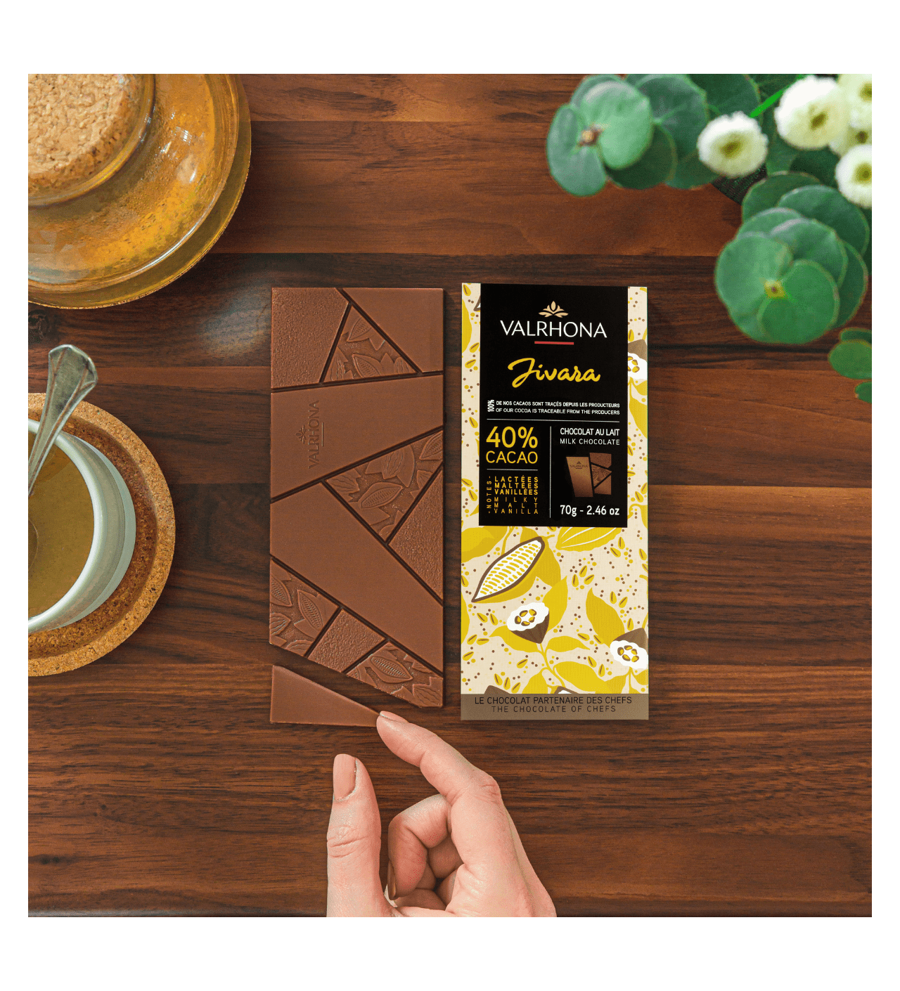 Hecho en Francia, esta tableta de chocolate con leche hace parte de la selección "Grand Crus" de la marca Valrhona. La combinación de cacao de Ecuador y Ghana hace del chocolate Jivara uno de los chocolates más emblemáticos de Valrhona.