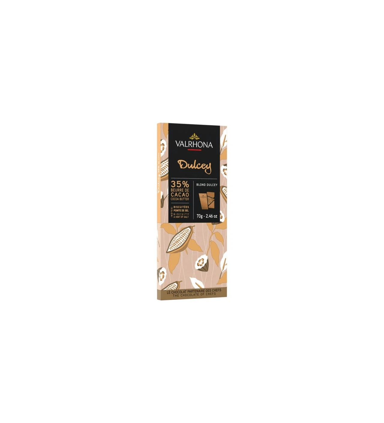 La tableta de chocolate de 70 g Dulcey Valrhona tiene un contenido de manteca de cacao del 35%. Este chocolate Valrhona, con un toque salado que realza todo su sabor, es 100% francés. El dulce y delicioso sabor a caramelo de esta tableta de chocolate da un toque cremoso que quedará grabado en tu boca al probarlo.