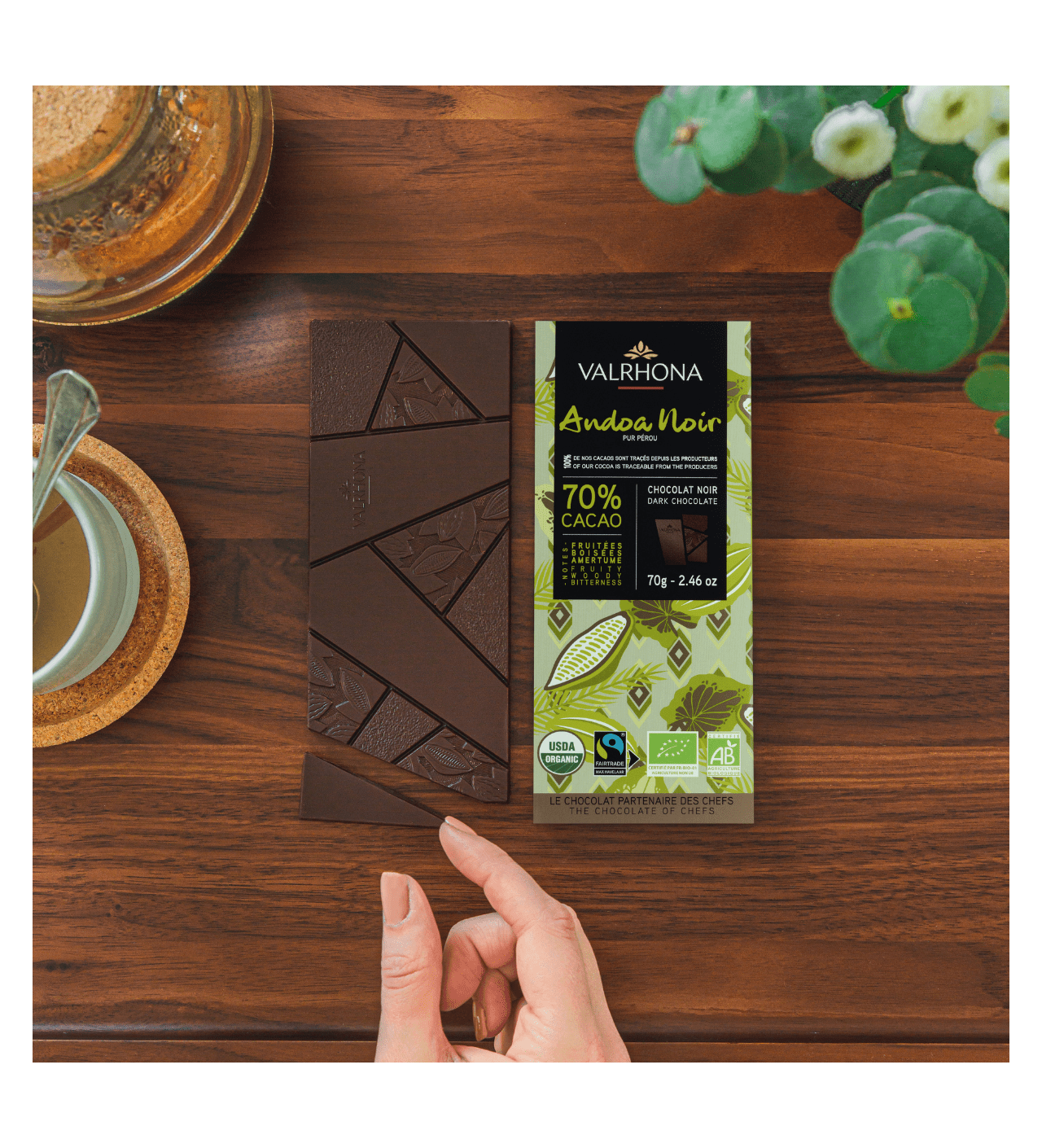 El chocolate bio es cada vez más popular en nuestras ventas de pastelería. ¡No te pierdas la tableta de chocolate negro Andoa 70% Bio 70 g Valrhona!