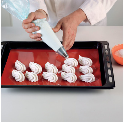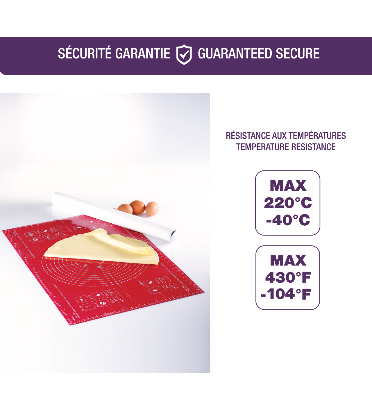 Con esta amalgama podrás amasar y estirar la masa en toda la superficie sin que se pegue. La lámina de silicona para hornear de Mastrad soporta hasta 250 °C en el horno, por lo que podrás usarla en tus recetas pasteleras del día a día.