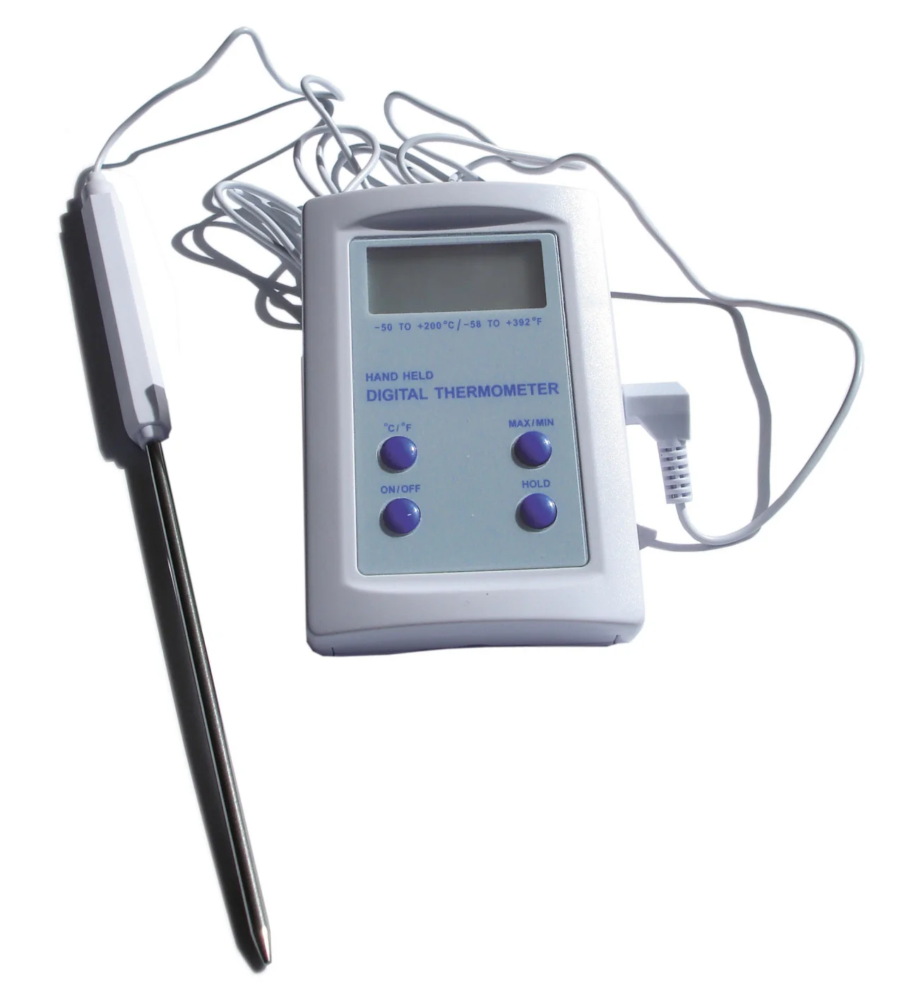 Termómetro con sonda de acero inoxidable de 90 mm (3,5 mm de diámetro). Cable de 110 cm de longitud.