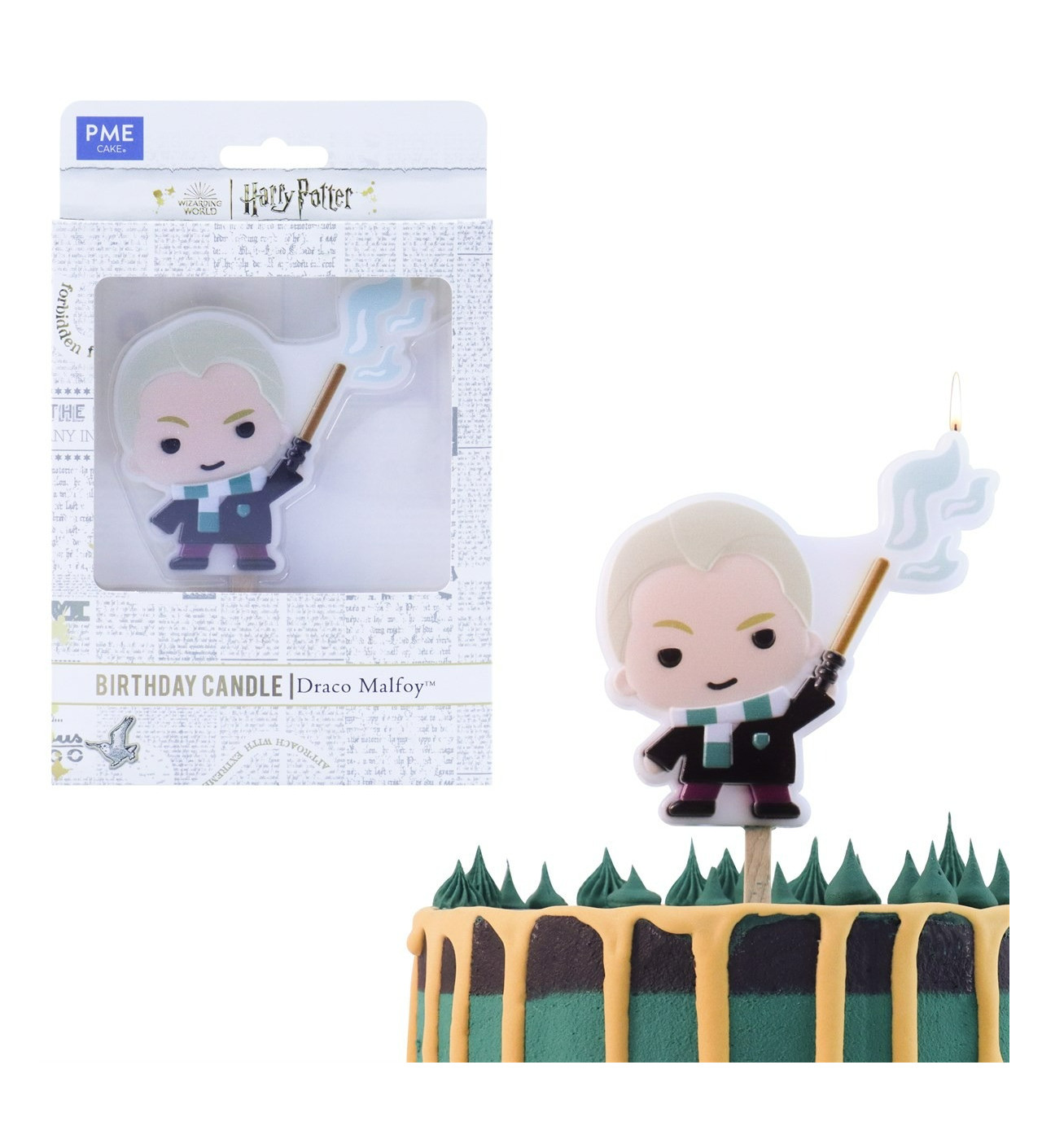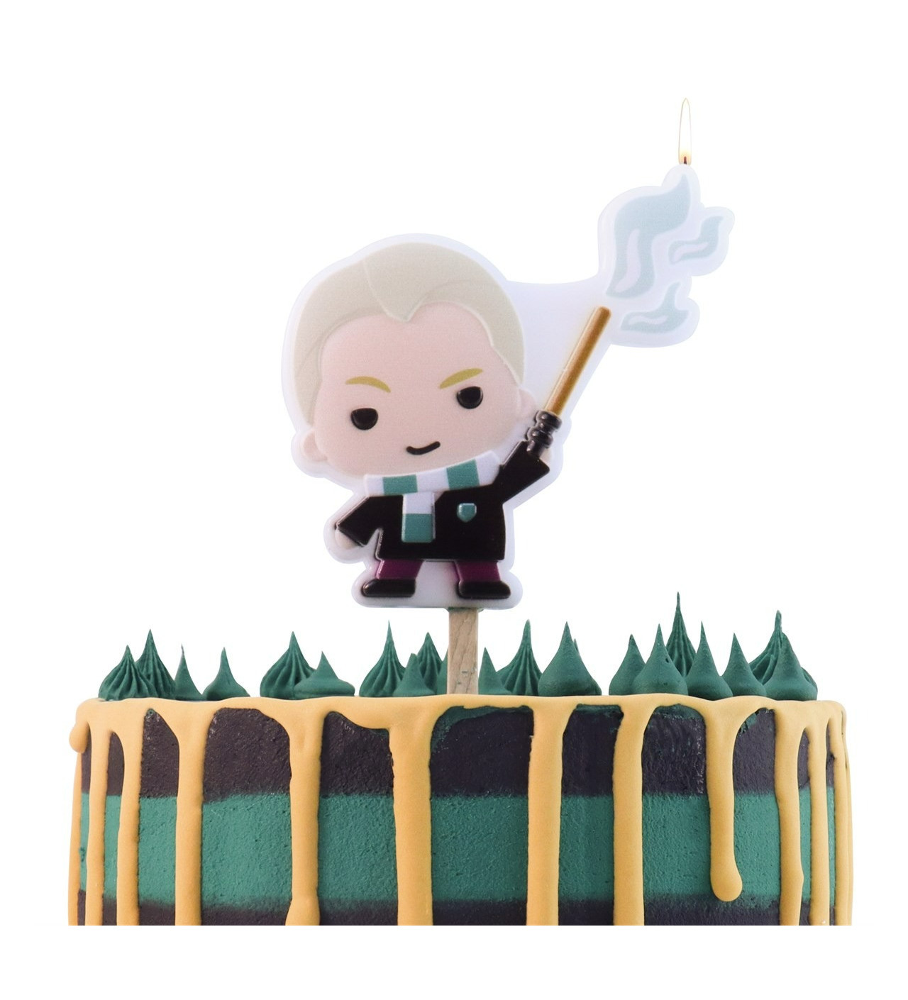 Esta vela para tartas de cumpleaños presenta la imagen de Draco Malfoy, el icónico rival de Harry Potter y ambicioso alumno de la casa Slytherin. Un detalle perfecto para los fans de este joven mago tan carismático como arrogante que aportará un aire original y misterioso a la decoración de tu pastel.