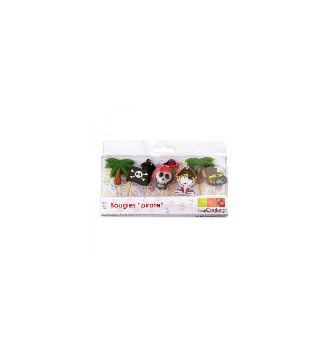 Este original lote de velas pirata para tarta de cumpleaños de ScrapCooking está inspirado en el mundo de la piratería e incluye 8 velas de cumpleaños diferentes.