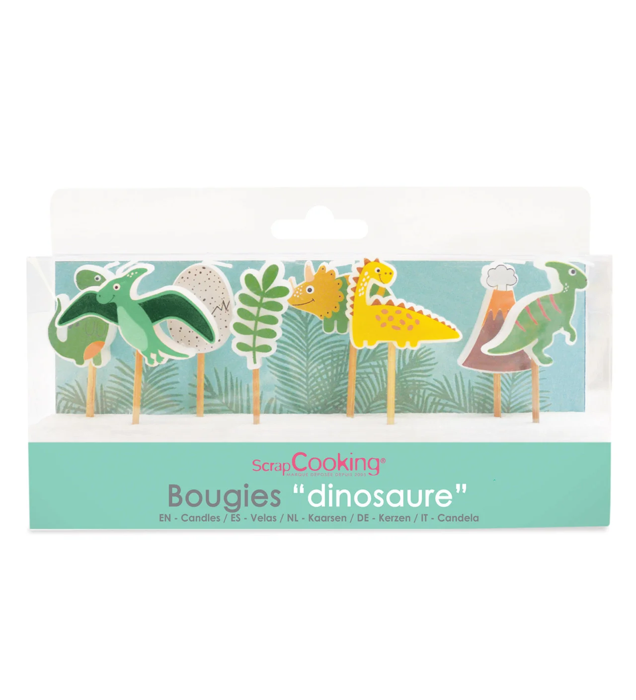 Para festejar un cumpleaños de dinosaurios, estas son las velas de pastel que estabas buscando. Diferentes dinosaurios, un volcán o un huevo de dinosaurio: estas velas de cumpleaños Scrapcooking perfectas para decorar una tarta de cumpleaños están hechas de parafina, miden 7,5 cm de alto, y vienen montadas sobre un palillo de madera.