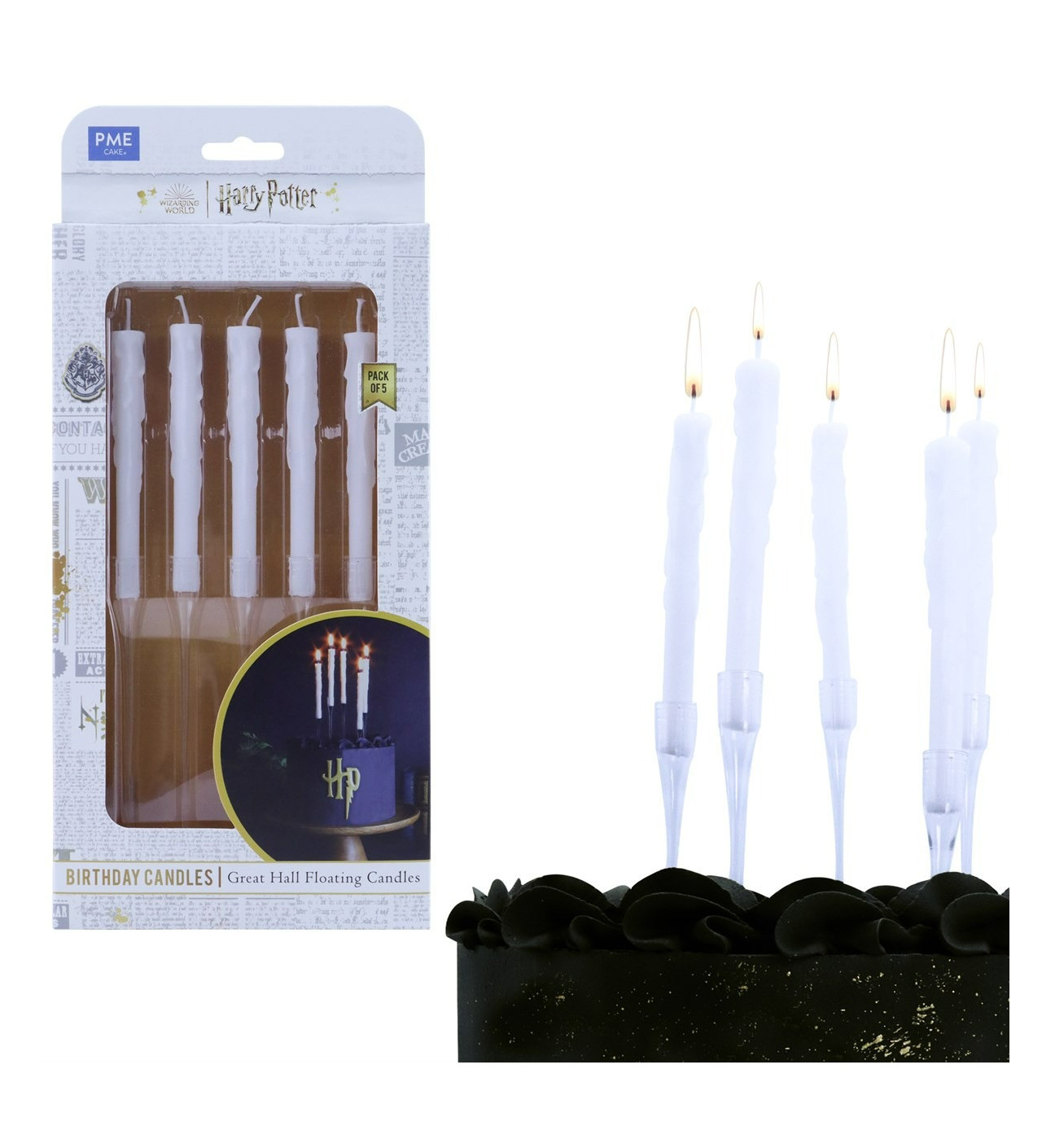 Esta decoración para tartas cuenta con cinco velas con soporte que crean la ilusión de estar suspendidas sobre el pastel, como si la magia estuviera realmente presente. Son perfectas para un cumpleaños o una fiesta temática de Harry Potter y transformarán al instante tus postres en una auténtica escena del mundo mágico.