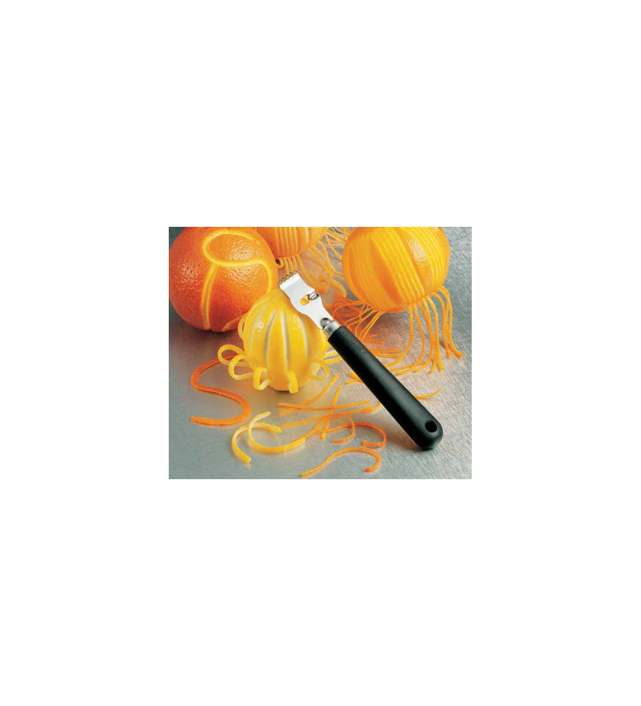 El acanalador Decozest de Déglon ofrece dos funciones: acanalador para decorar cítricos y frutas, y rallador de cítricos o zester para rallar hebras finas de la cáscara de cítricos y perfumar bebidas, cremas o salsas.