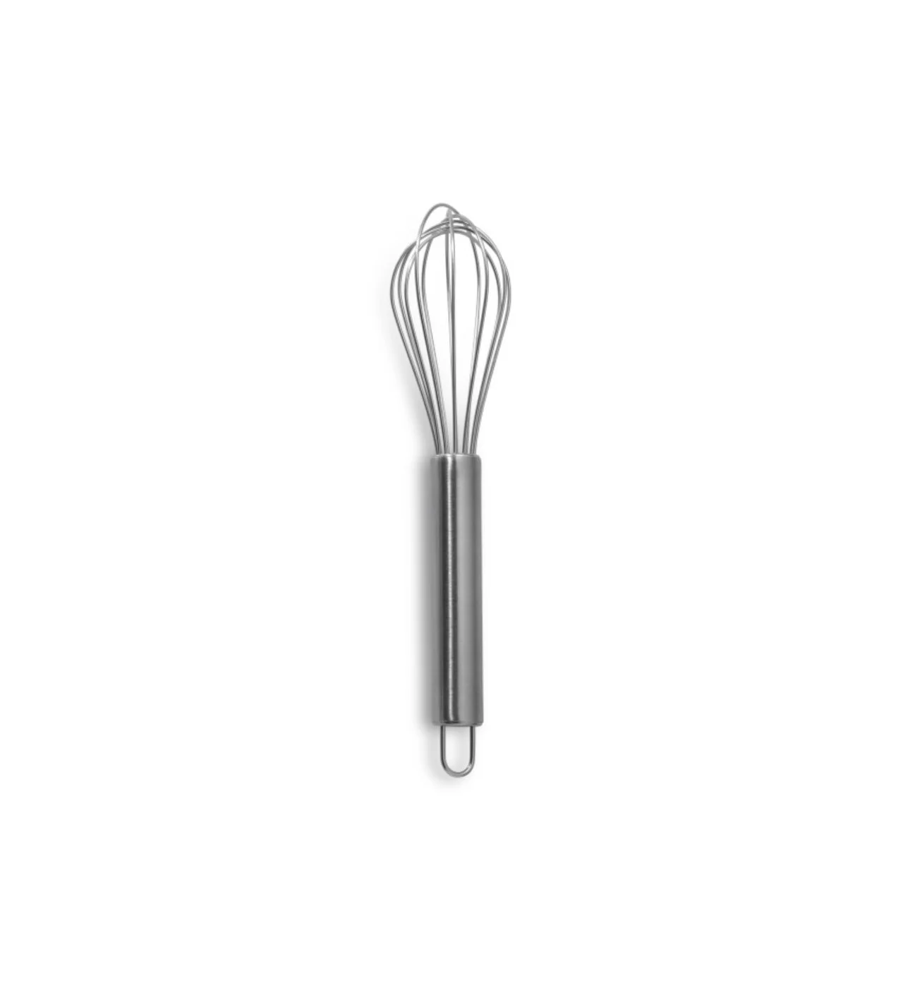 Este batidor manual de 21,5 cm de longitud ofrece un formato manejable, ideal para trabajar cómodamente tanto pequeñas como medianas cantidades. Su mango liso te proporciona un agarre cómodo, mientras que el orificio para colgar facilita su almacenamiento y permite escurrirlo después de cada uso.