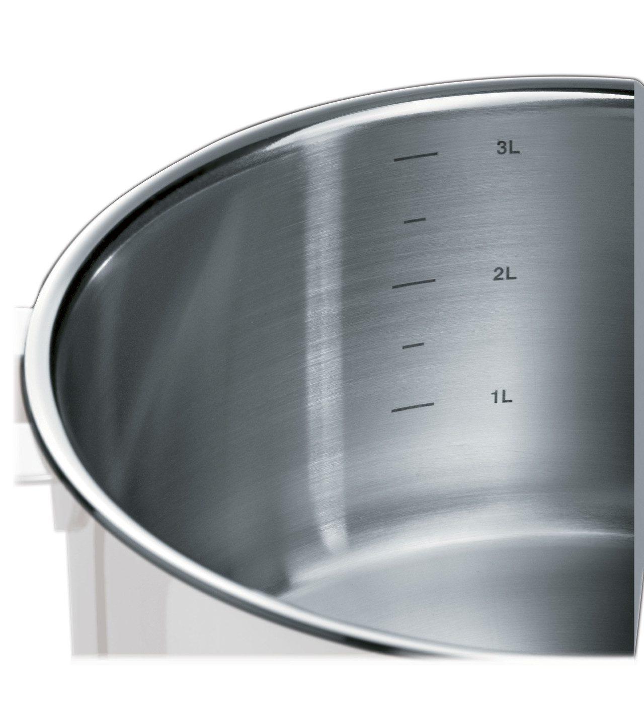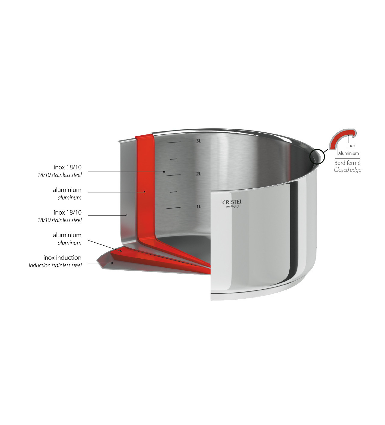 Su material único compuesto de varias capas de acero inoxidable y aluminio distribuye el calor en toda la cacerola y evita que se concentre únicamente en el fondo. Esta combinación de capas garantiza una cocción suave, uniforme y eficiente.