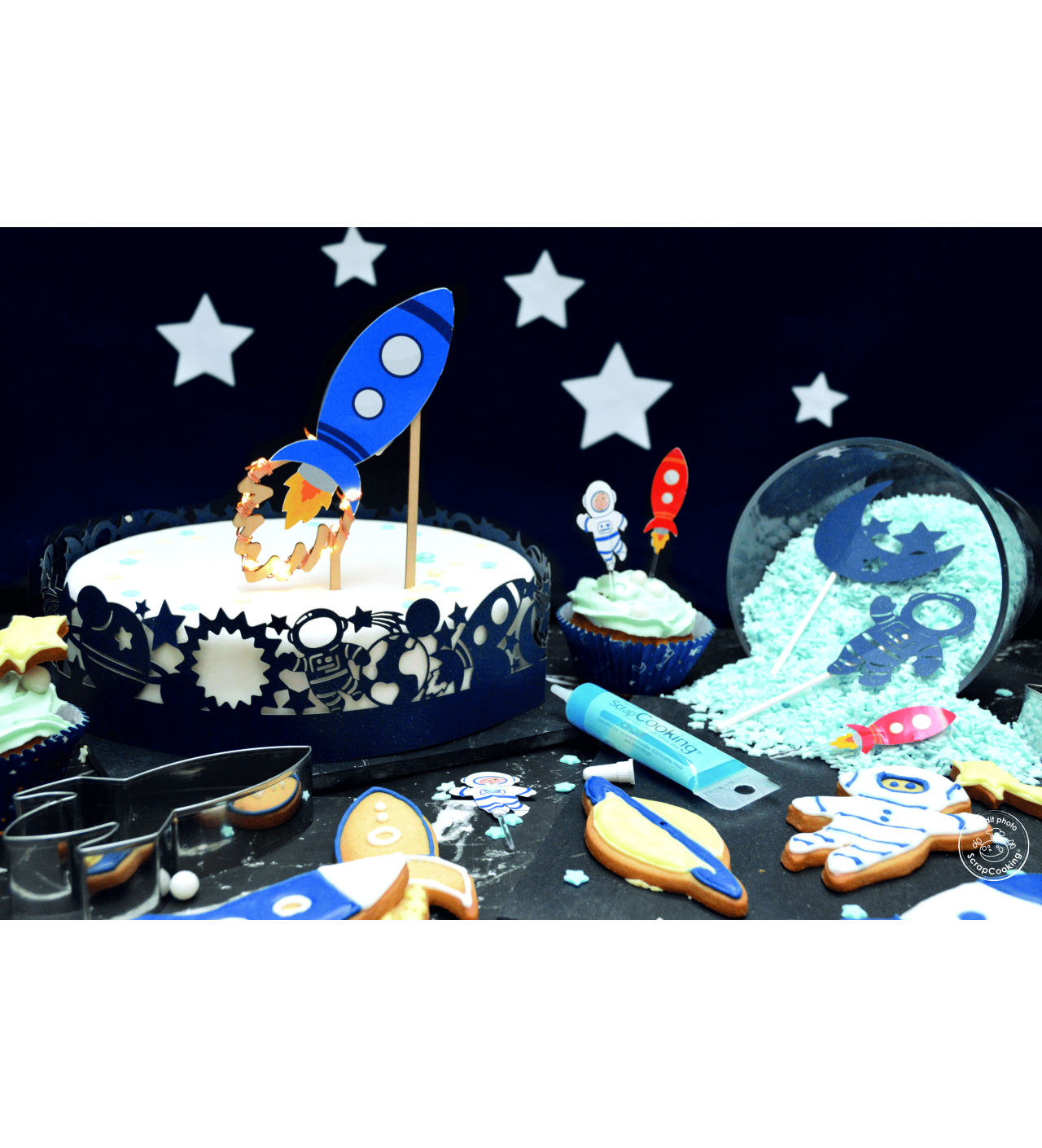 ¡3, 2, 1... despegue! Emprende una exploración por el firmamento de la dulzura con una decoración para pasteles nunca vista. Para decorar la tarta de cumpleaños de tu pequeño astronauta que vive con la cabeza en las nubes, regálale un viaje al espacio con el cake topper led de cohete de Scrapcooking. Este topper para tarta de cumpleaños es de temática infantil y, sin embargo, muy sofisticado: no se trata solo de un cake topper, ¡sino de una invitación a soñar y saborear!