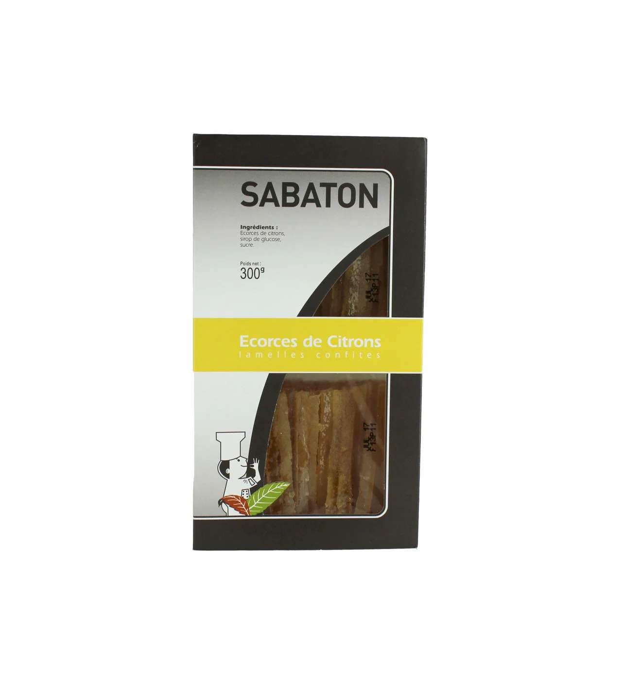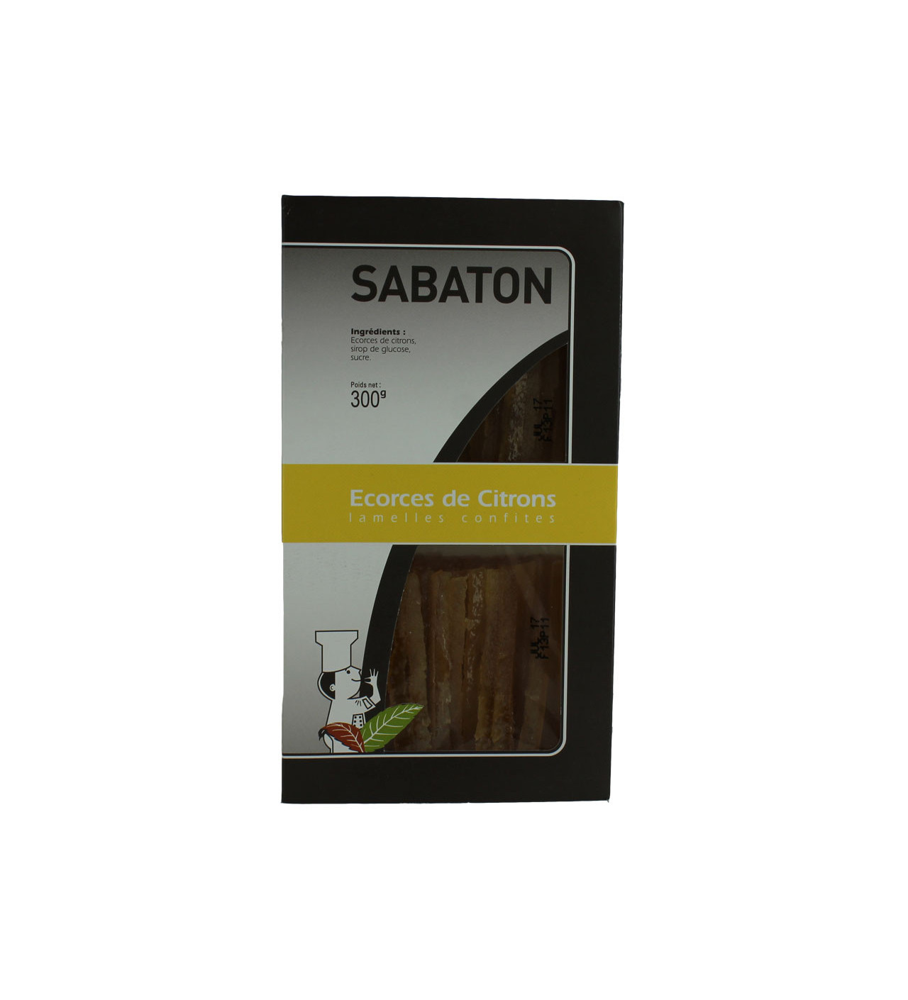 Las cáscaras de limón confitadas en tiras de Sabaton están envasadas en una atmósfera protectora dentro de 2 barquetas de plástico, cada una de 150 g.