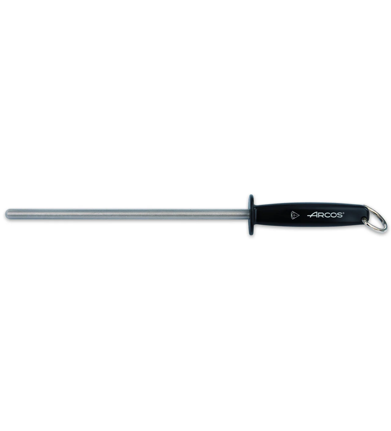 Para mantener el filo de tus cuchillos de cocina y así prolongar su vida útil, no olvides finalizar el afilado con la chaira de diamante Arcos. Está equipada con una varilla redonda de 24 cm de largo y 1 cm de diámetro, fabricada en acero al carbono y recubierta con polvo de diamante.