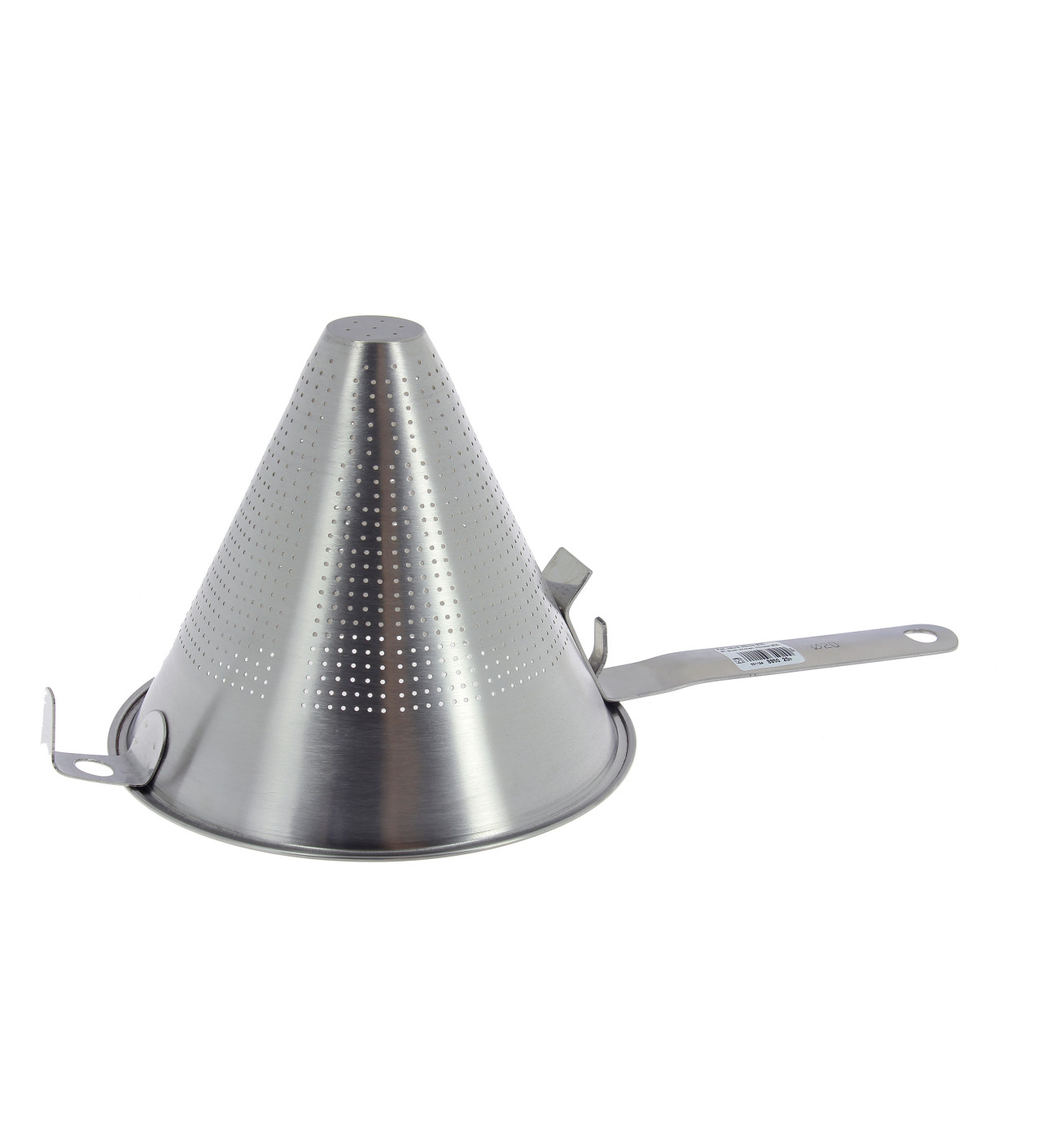 El colador chino de acero inoxidable Ø 23 cm cuenta con perforaciones de tamaño estándar de 1,5 mm de diámetro. Además, el colador chino incluye pequeños ganchos que garantizan una gran estabilidad cuando coloques el utensilio sobre un bol o una olla.