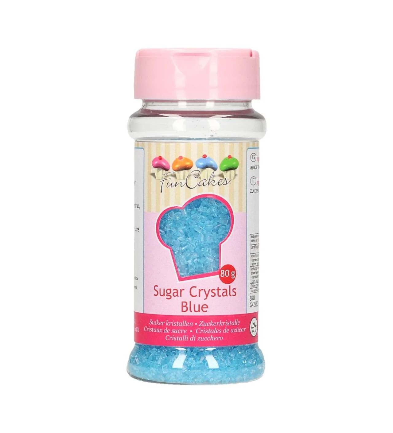 Envasados en un frasco con cierre hermético, estos 80 g de cristales de azúcar para decorar deben conservarse en un lugar seco protegidos de la luz.