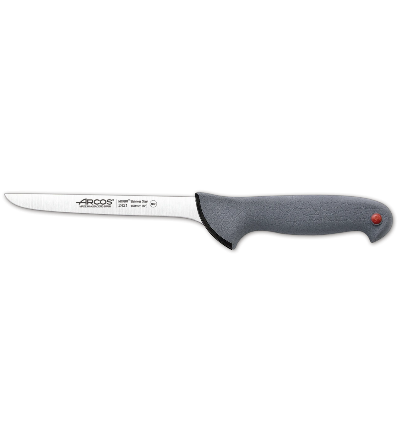 El cuchillo deshuesador Arcos de 15 cm tiene un botón rojo, un código de color que indica que está reservado exclusivamente para el corte de carne, conforme a las recomendaciones del sistema APPCC. Su hoja de filo liso está fabricada con acero inoxidable NITRUM, una innovación exclusiva de la marca española Arcos. La hoja de este cuchillo Arcos, notablemente más resistente y afilado que los cuchillos tradicionales, está reforzada con el tratamiento térmico Ice Plus, un proceso que aumenta significativamente su resistencia a los golpes y el desgaste.
