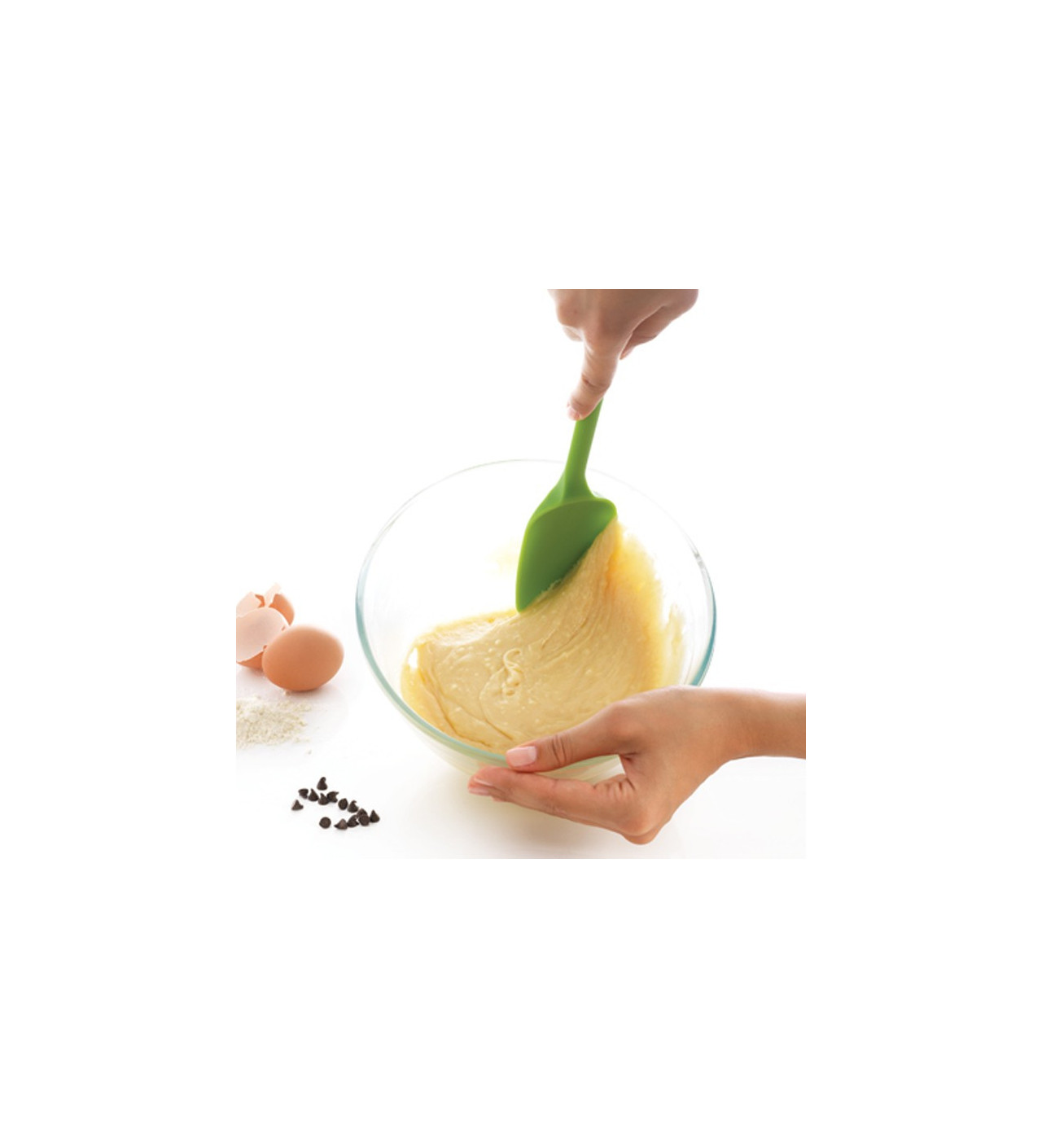 Además de fexible y resistente, esta espátula de cocina con cabezal flexible también puede usarse como lengua de cocina. Además, no le teme al calor, ya que soporta temperaturas de hasta +300°C. Esta espátula de cocina no solo evita la acumulación de bacterias gracias a su estructura de una sola pieza de silicona, sino que también puede mantenerse al alcance a gracias a su orificio para colgar que te permite guardarla fácilmente.