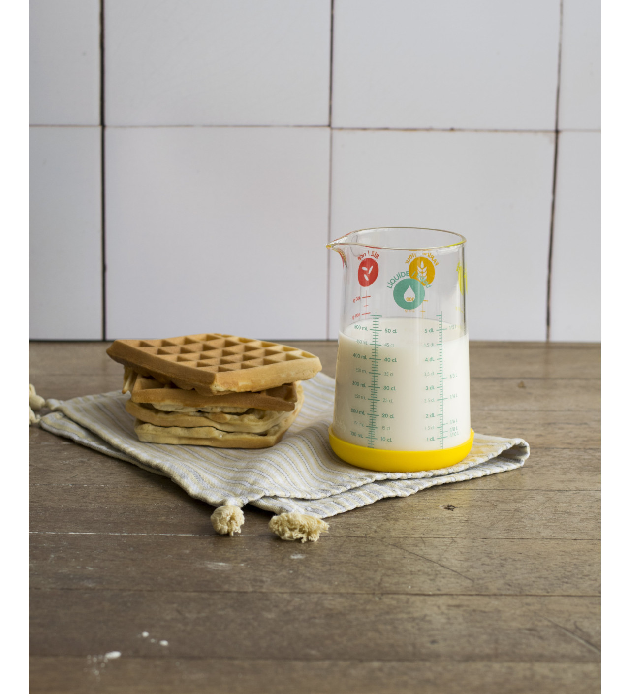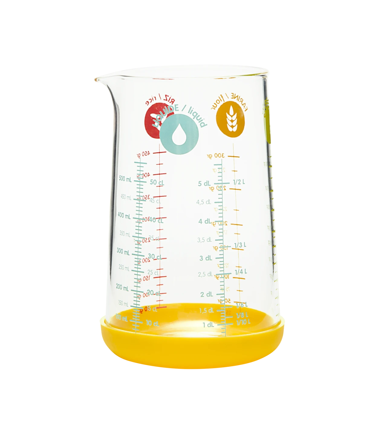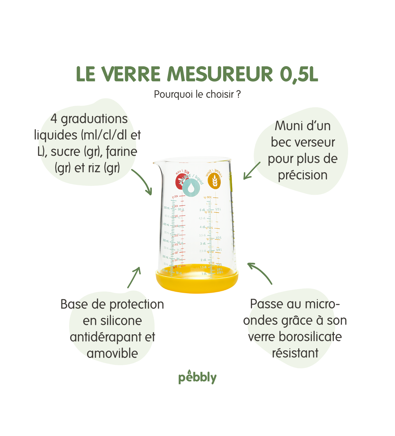 Ya sea para medir, derretir en el microondas o conservar tus preparaciones en frío, ¡la jarra medidora de cristal con base de silicona de 500 ml amarillo Pebbly se adaptará a tus necesidades en la cocina!