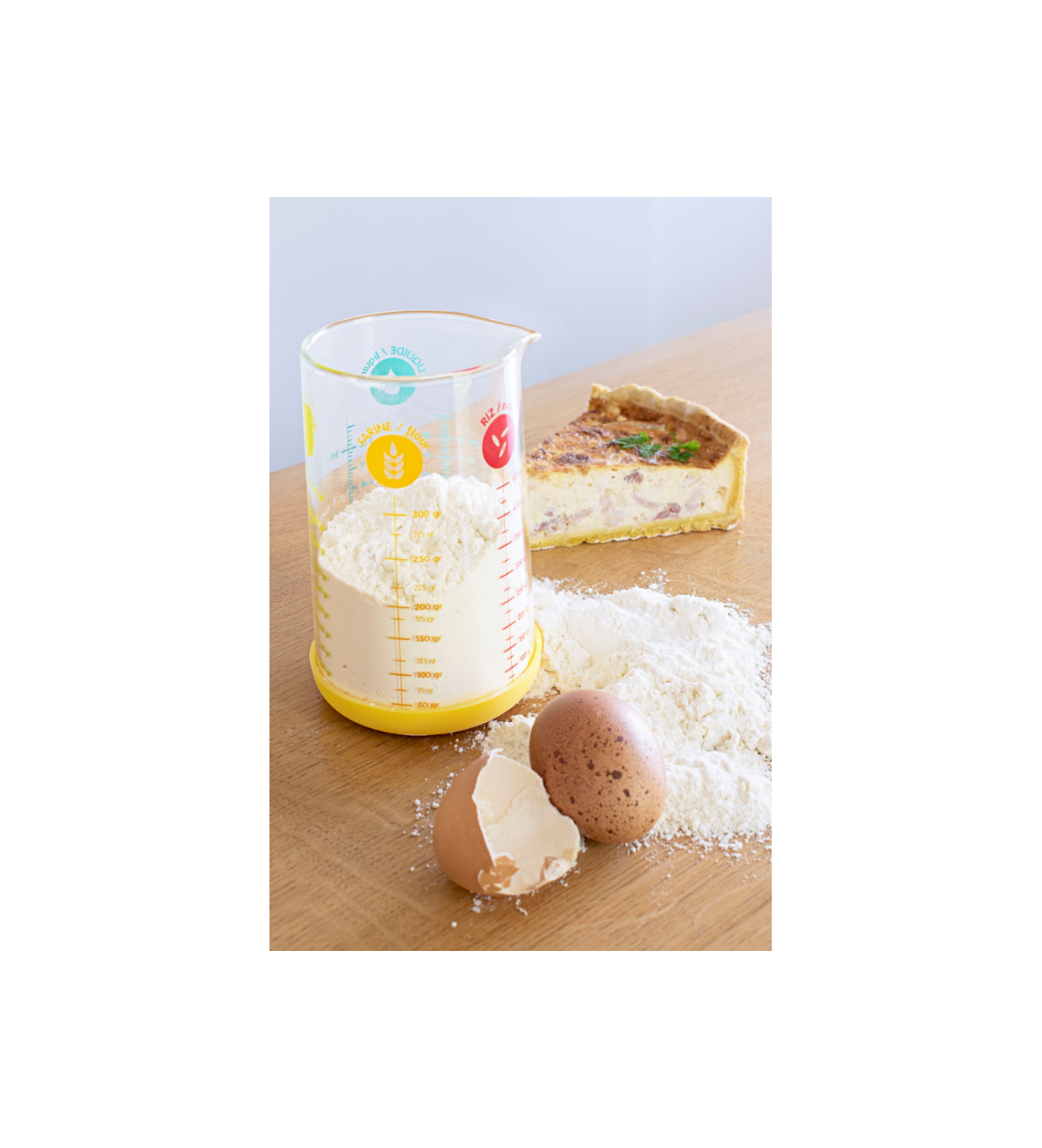 Este medidor de cocina está hecho de vidrio borosilicato y cuenta con un pico vertedor que facilita el vertido de tus alimentos. Además, cuenta con una base de silicona amarilla removible que aporta color, estabilidad y protección contra posibles golpes. Gracias a la robustez de su material, la jarra medidora resiste a choques térmicos, permitiendo pasar del microondas (hasta 300°C) al refrigerador, ya sea para calentar leche o mantener fría una crema antes de convertirla en chantilly.