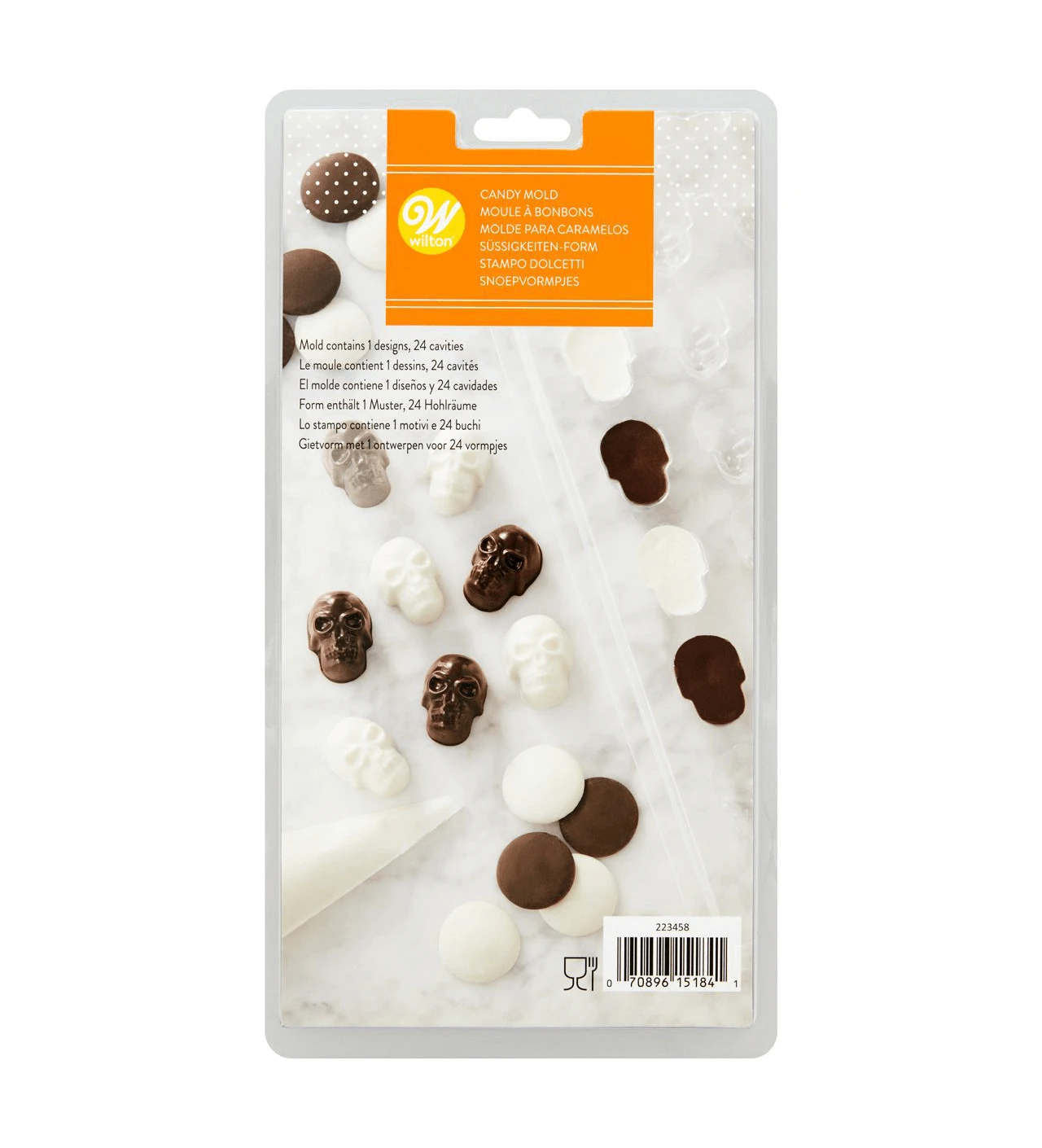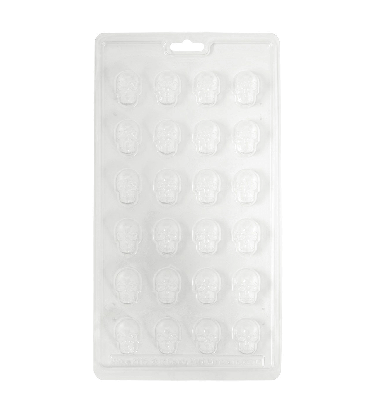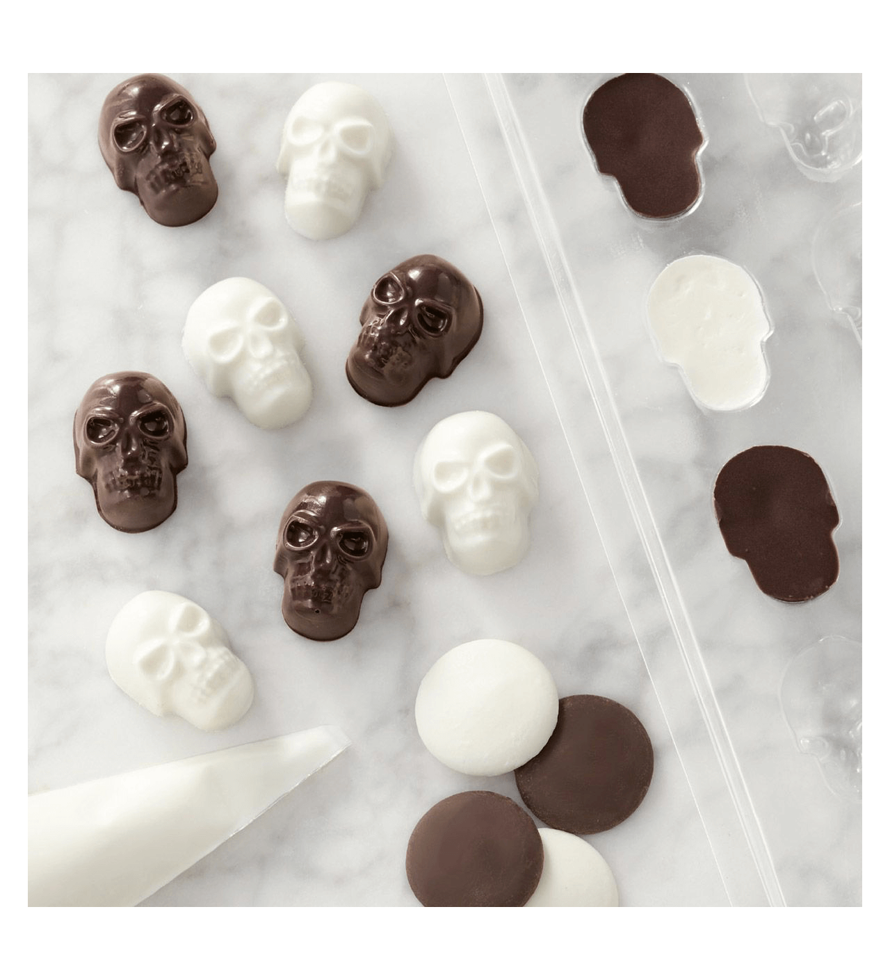 ¡Prepara golosinas terroríficamente deliciosas con el molde para chocolate de calaveras! Este molde para chocolate cuenta con 24 cavidades para crear 24 bombones de calavera o cubos de hielo de calavera. Utilizar el molde es muy sencillo: funde en el microondas chocolate de cobertura y viértelo en una manga pastelera. Luego, rellena las cavidades del molde de chocolate de calaveras. Un paso por la nevera y ¡los aterradores bombones de chocolate estarán listos para ser devorados o para decorar una tarta o cupcake!