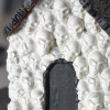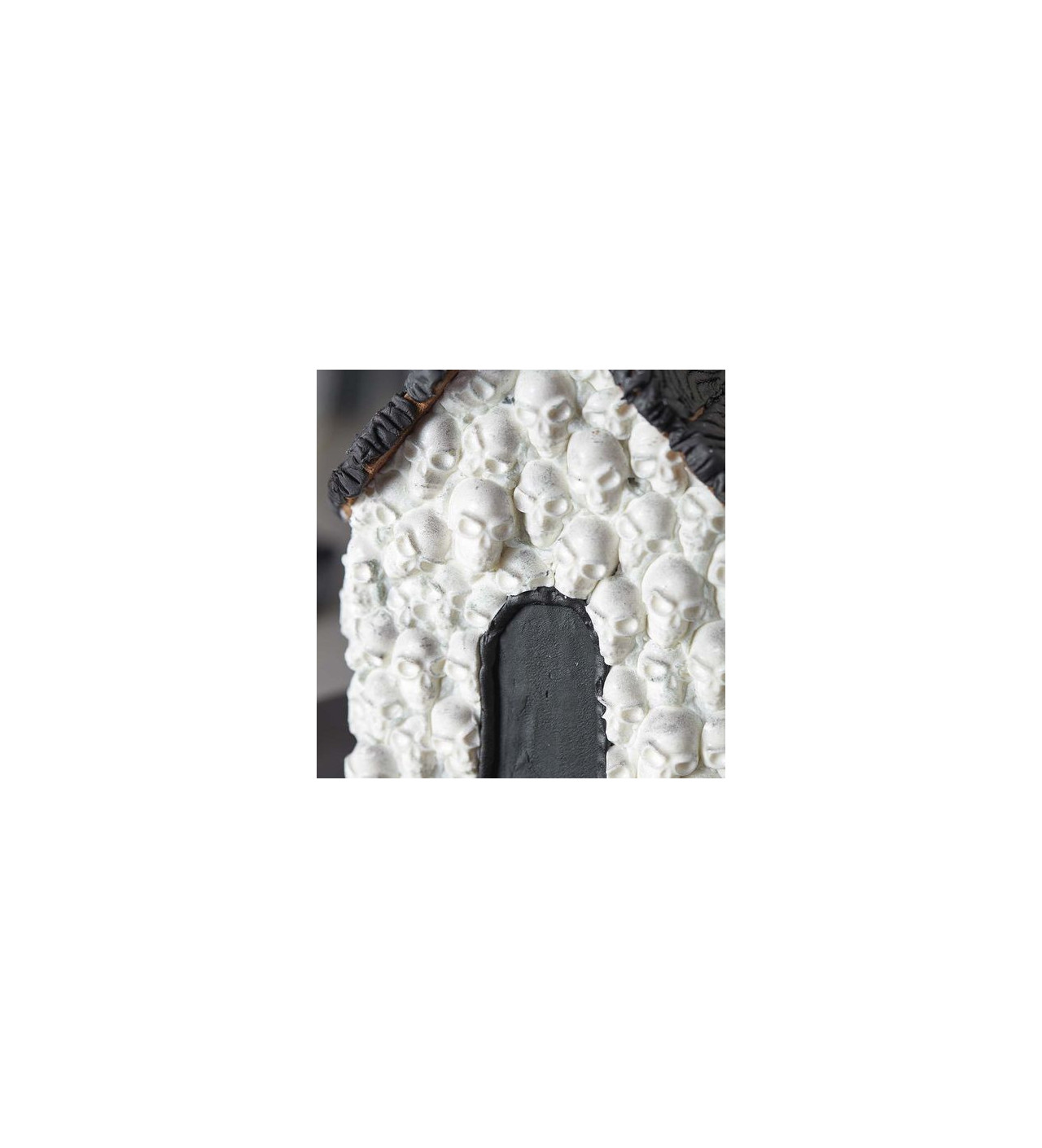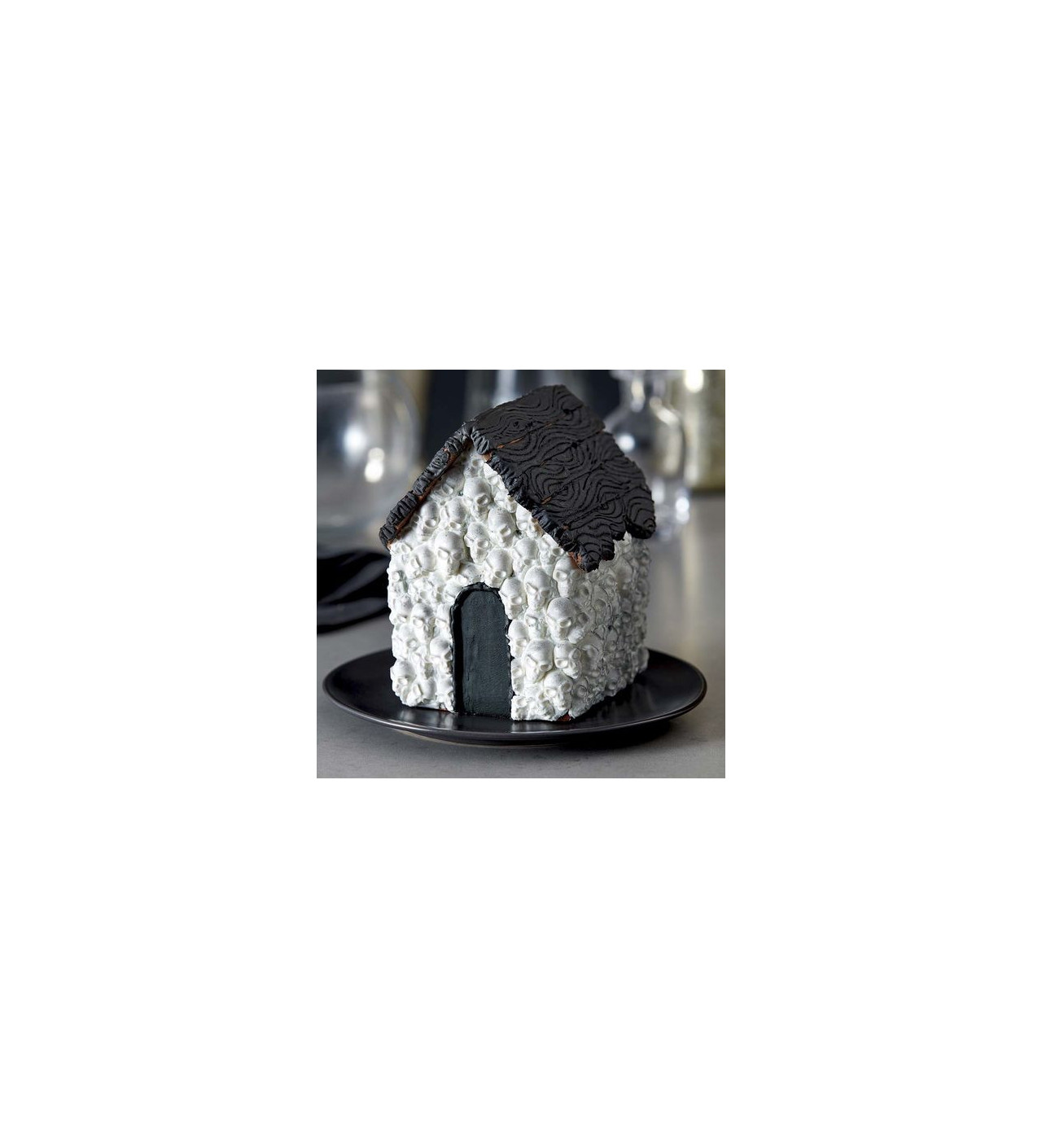 Haz una buena cantidad de bombones calavera y pégalos uno a uno sobre la estructura, utilizando el mismo método que para montar las paredes y el tejado. Para encajar mejor el cráneo en un borde o simplemente fijarlo, puedes fundirlo ligeramente, ya sea sobre una fuente de calor o calentando la punta de un cuchillo. Para darle un efecto de piedra desgastada, pasa un pincel con colorante alimentario en polvo por la superficie.