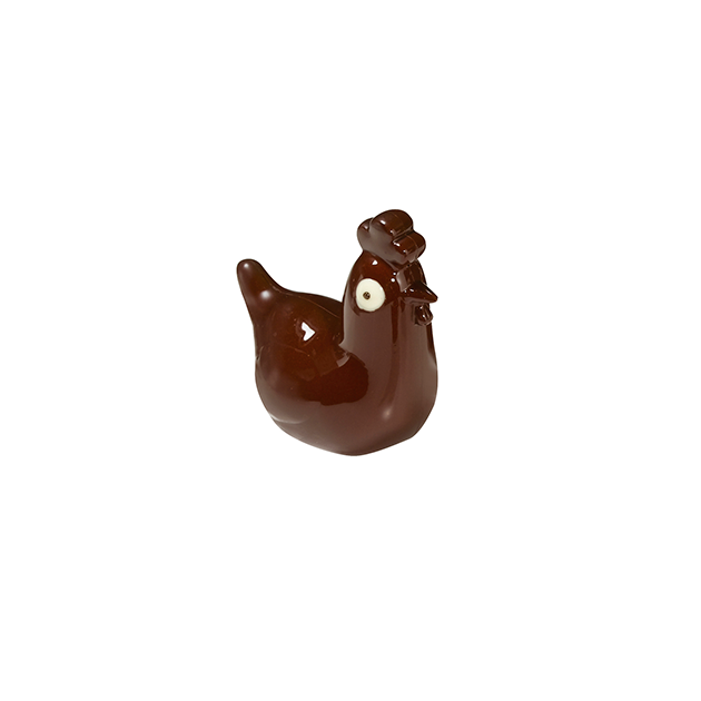 La pieza de chocolate pesará 65 g, o más si añades pequeños caramelos o figuras de Pascua antes de unir las dos mitades. Para conseguir una gallina con un plumaje sedoso y brillante, atempera el chocolate de cobertura y aplícalo con un pincel alimentario en las cavidades de este molde para chocolate. Deja que se solidifique en frío durante unos diez minutos y aplica nuevas pinceladas. Repite la operación las veces necesarias hasta obtener una cáscara lo suficientemente gruesa para conseguir una gallina brillante y crujiente.