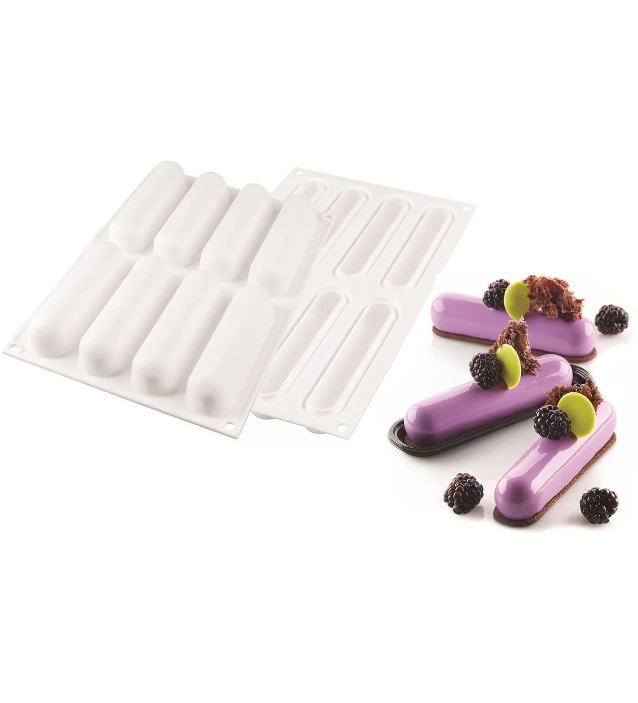 Realiza postres individuales tan hermosos como deliciosos con el molde de silicona modelo Fingers de la marca SilikoMart Professional. Se vende por unidad, mide 30 x 175 mm y cuenta con 8 cavidades de 130.5 x 25 x 27 mm. El molde de silicona para repostería viene con un cortador y diez envases pequeños de plástico reutilizables. Estos accesorios son perfectos para cortar una galleta o un crocante del tamaño correcto y prolijamente, luego darles una hermosa presentación.