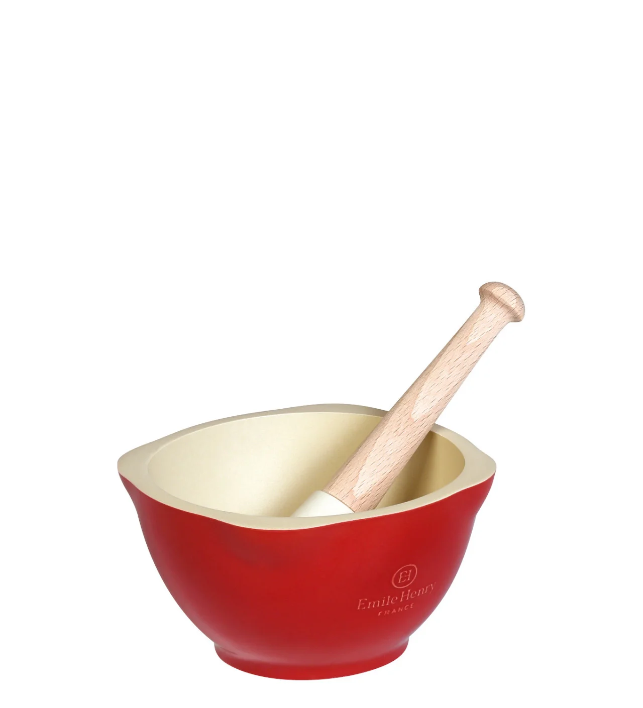 El color rojo intenso del mortero de cerámica añadirá un toque de encanto y elegancia a tu cocina. Su diseño único, trabajado a mano por los artesanos de Emile Henry, refleja la simplicidad y delicadeza del trabajo artesanal. Hecho de cerámica de alta resistencia, este mortero de Emile Henry es un producto de calidad que garantiza una excelente adherencia de los alimentos a las paredes, facilitando su trituración. Además, este mortero de cocina no retiene olores ni manchas después de su uso y es fácil de limpiar, ya que puede lavarse en el lavavajillas sin riesgo de dañar el esmalte.