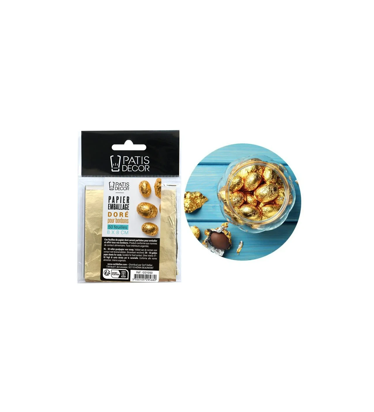 El papel presenta un elegante acabado dorado en el exterior y plateado en el interior, en un práctico formato cuadrado de 8 × 8 cm, perfecto para envolver huevos de diferentes tamaños. Para un resultado óptimo, se recomienda dejar enfriar completamente el chocolate antes de utilizar esta envoltura para dulces.