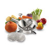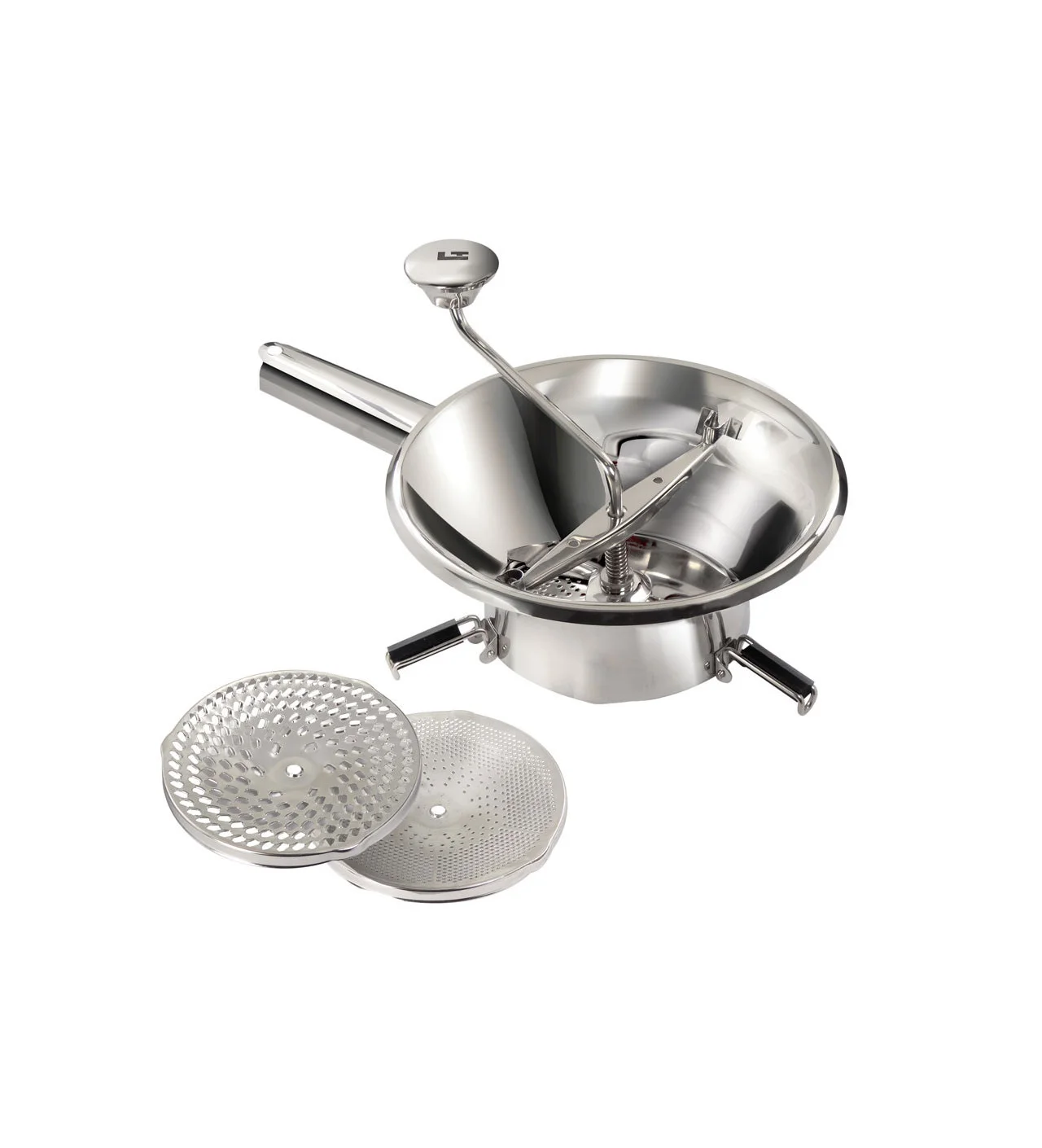 El pasapuré está compuesto de 3 rejillas de acero inoxidable intercambiables (1,5 mm, 2,5 mm y 4 mm) y está equipado con 3 patas antideslizantes que te brindarán estabilidad al trabajar en una superficie. Para usar el pasapurés de acero inoxidable sobre un bol, un recipiente o cualquier otro, las patas son retráctiles.
