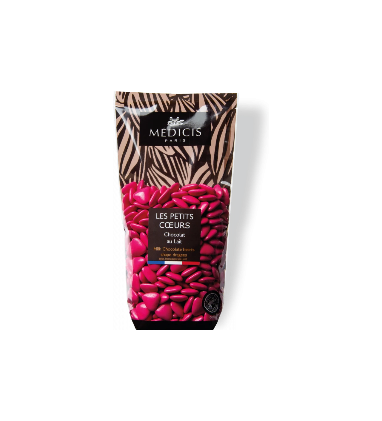 ¡Admira el color de estas peladillas! Estas pesadillas de chocolate con leche en forma de corazoncitos de Médicis sorprenderán a todos tus invitados. Las deliciosas peladillas de colores Médicis están hechas de chocolate con leche moldeado y una fina capa de azúcar rosa.