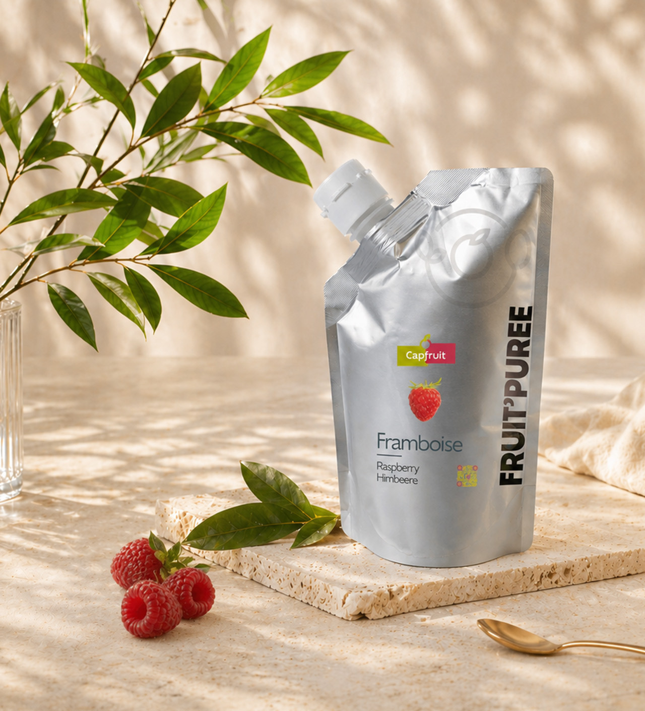 Descubre el puré de frambuesa de Capfruit, compuesto por un 90% de frutas. Este puré de frutas es un concentrado de sabores que te permitirá realizar sabrosas recetas.