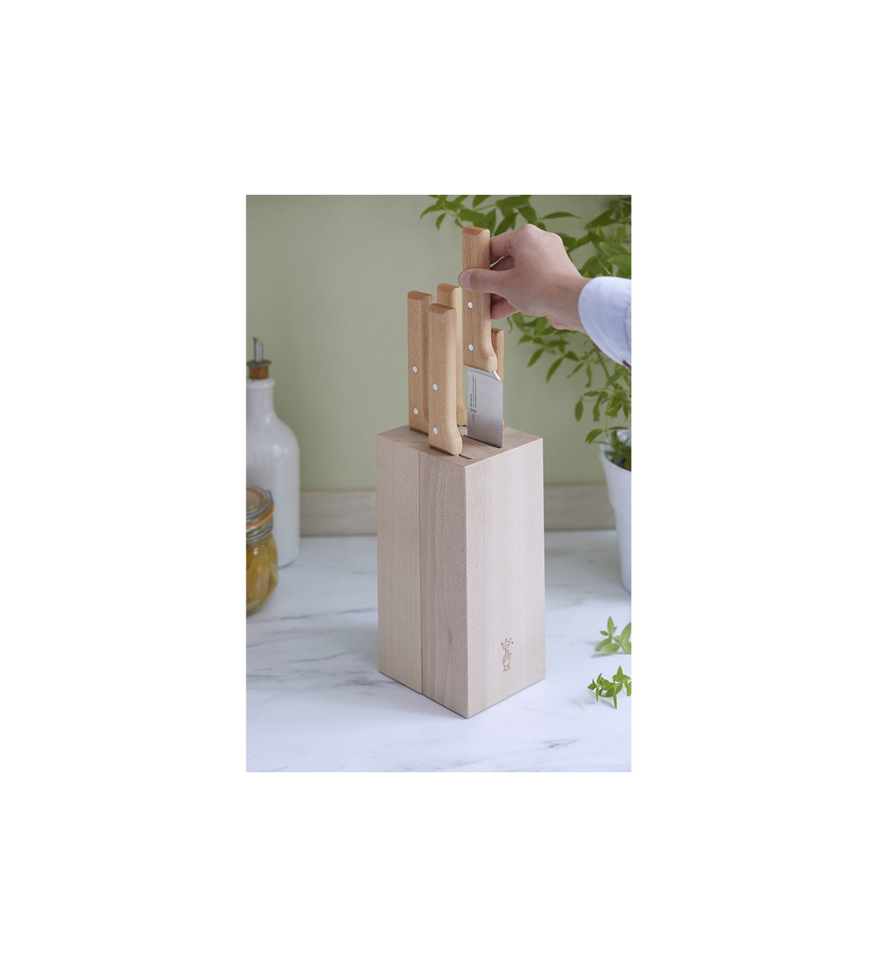 El taco para cuchillos de Opinel es un regalo perfecto, tanto para ti mismo como para tus seres queridos. Fabricado en madera de haya procedente de bosques franceses y diseñado para contener 5 cuchillos de cocina, este bloque destaca tanto por su robustez como por su elegancia. La madera clara le aportará a tu cocina un toque natural y auténtico. Además, cuenta con almohadillas en la base para evitar que se raye la encimera.